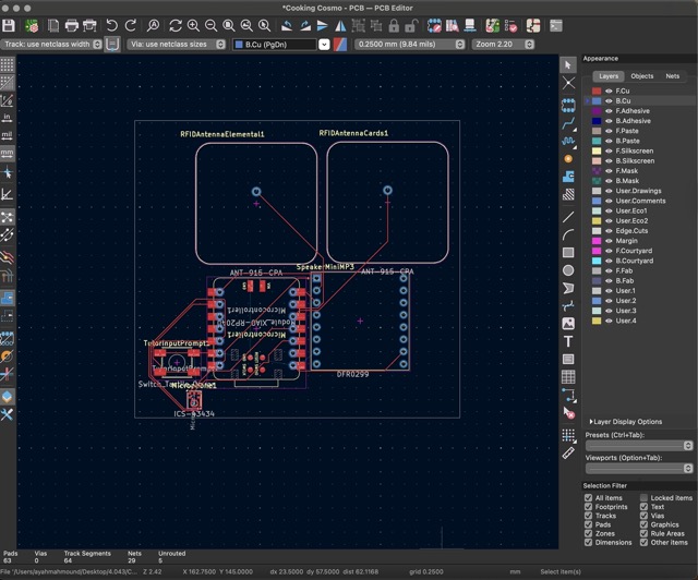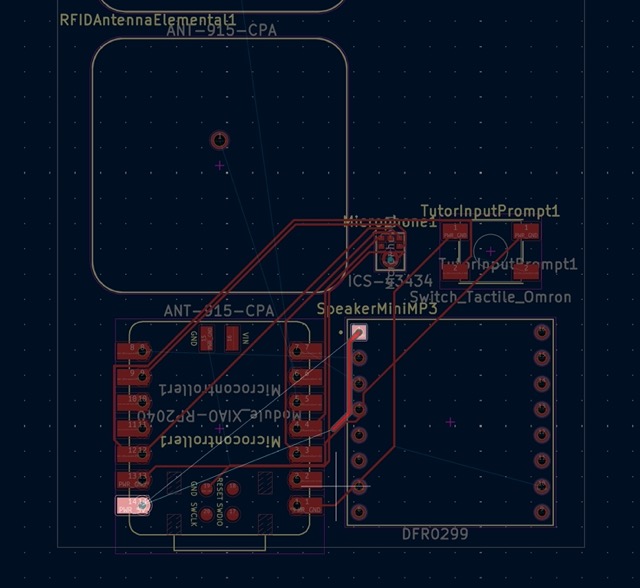 First, I started with the schematics and class KiCAD repository made things so much easier because I could just look up the exact component from the table that I wanted to use and instantly have the symbols for it. I think the only components I had issues with was the RFID antenna, because they only had a singular pin so I wasn’t quite sure how to connect it to the circuit, and the speaker. Since the mp3 player component had an audio output pin, I thought maybe I should attach an actual speaker to it? For this design, I really didn’t pay a close attention to having clean wiring, but I realized in the next part that it’s important to be able to see exactly which pins components are attached to. I also liked that this schematic environment lets me focus in on the actual circuit, instead of the overall layout of the board. I think I’ll throw up if I ever have to make my own components though...