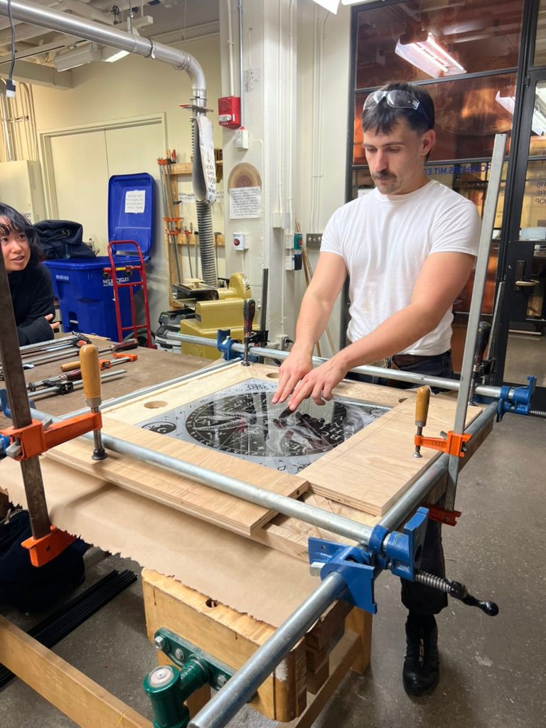 This is the first shot of the table all glued up, we then clamped it down and let it sit overnight.
