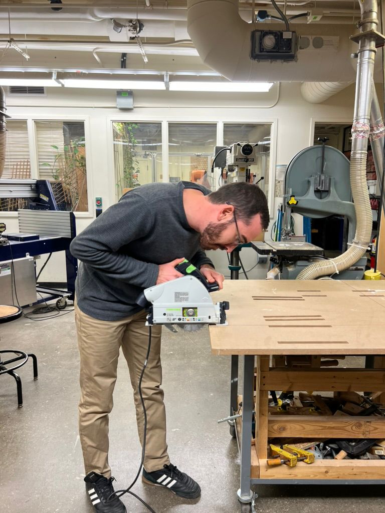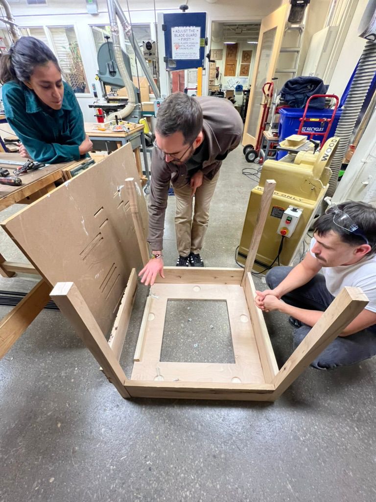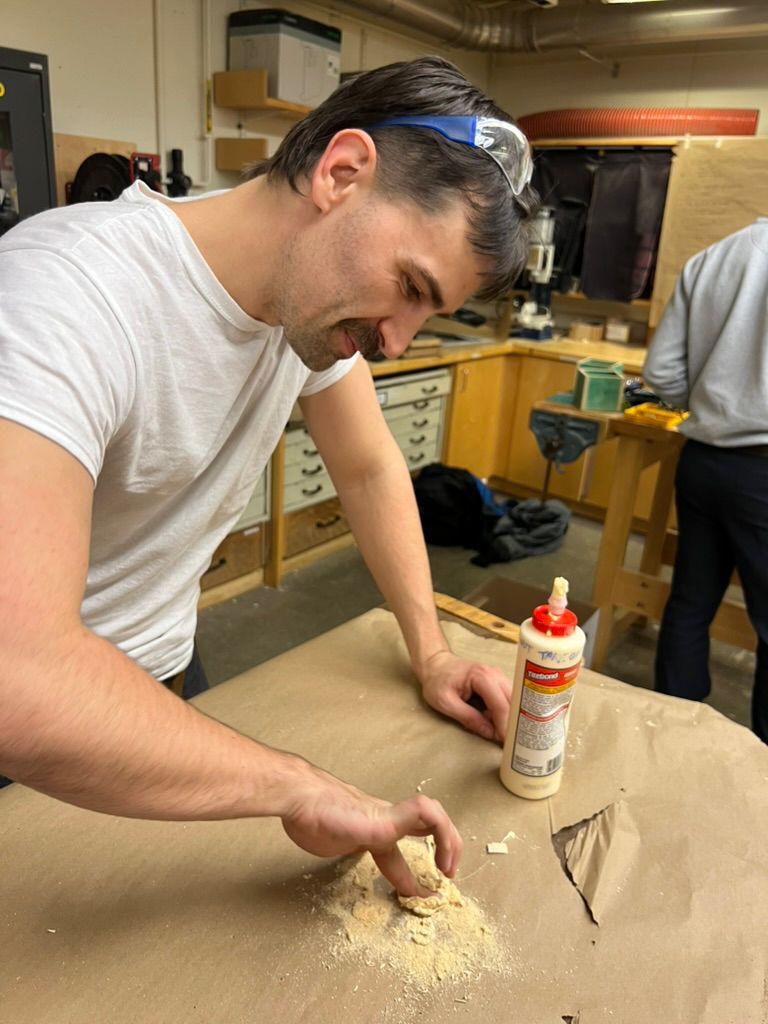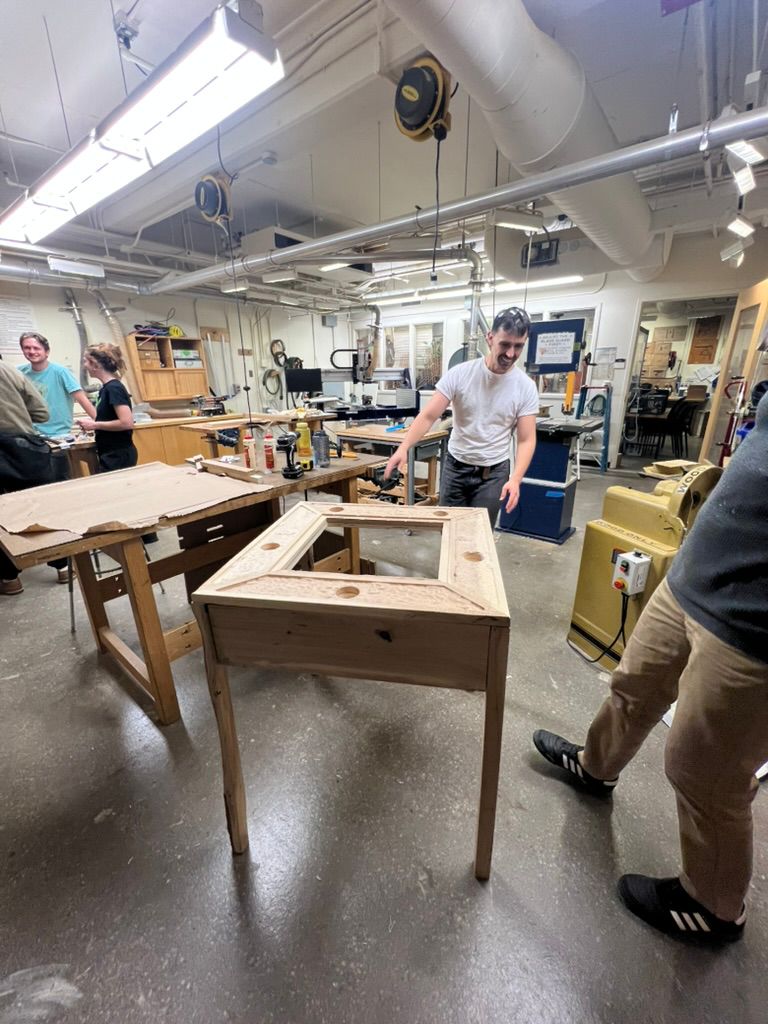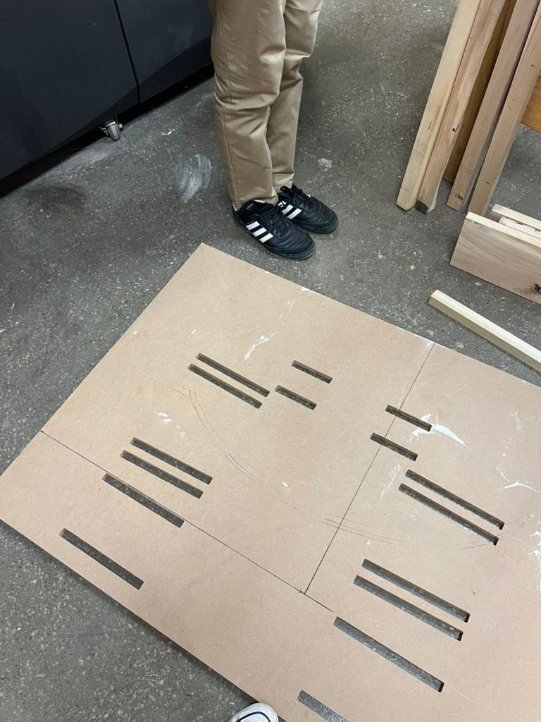 The major recurring challenge throughout this process was that the wood panels and parts had been cut from a "green" log, ie not treated, so it was imperfect and none of the fits were quite flush. To remedy this, we made some markings with a pen and hand sawed pieces to make the fits a bit better and hopefully the table more stable.