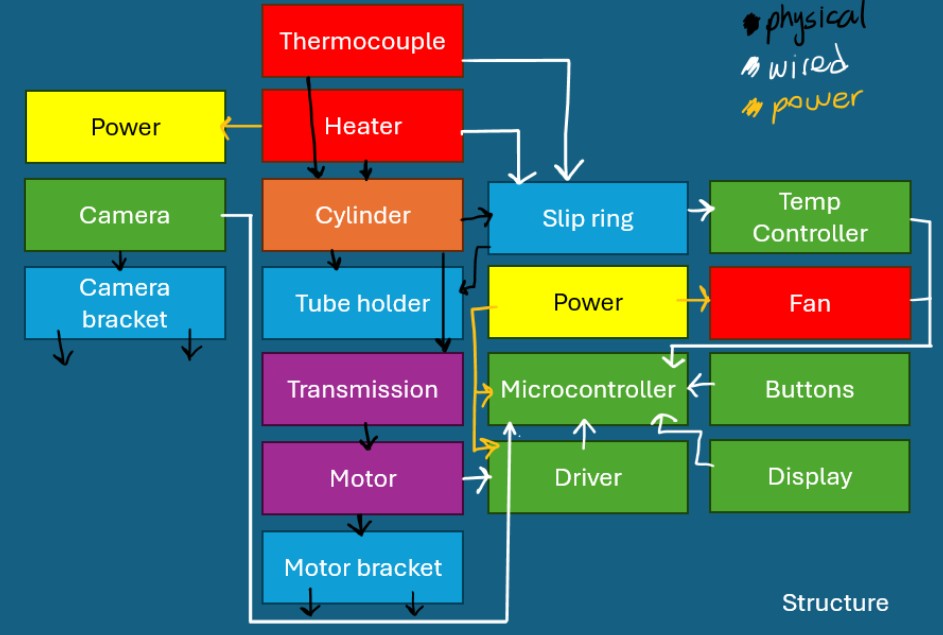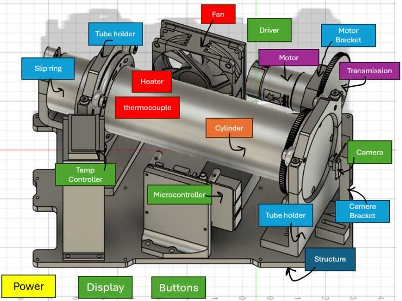 Display: to show current parameters for motor, heater, temperature, time stamp and possibly other information. Menu to change modes and select preexisting programns/ramps.