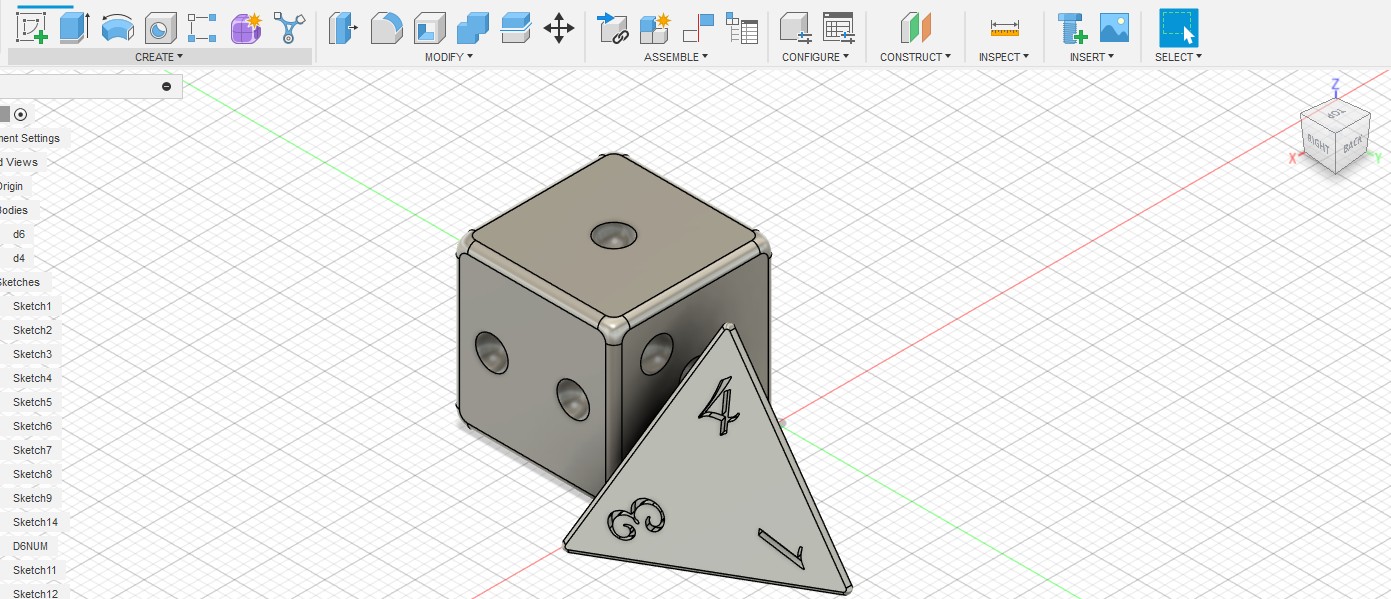 And that was how to make d4 and d6 in Fusion. As the difficulty ramps up, Fusion and Solidworks might have a harder time parametrizing a dodecahedron, for example, while Blender would be very easy.