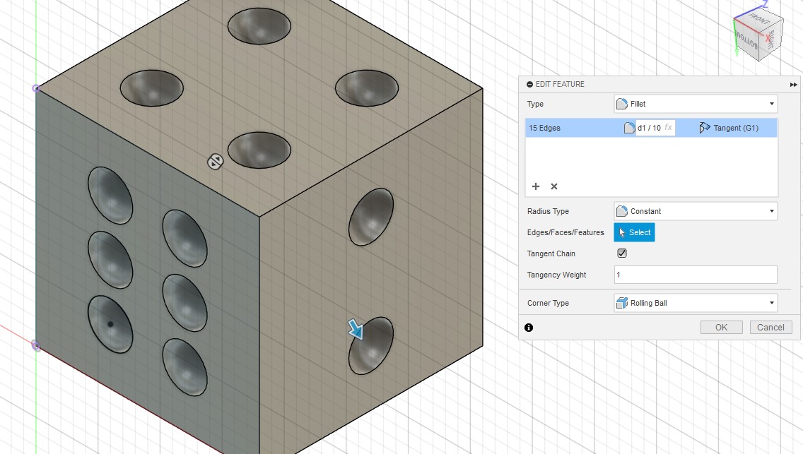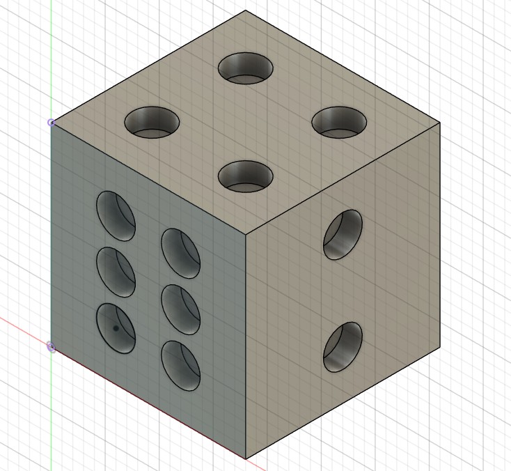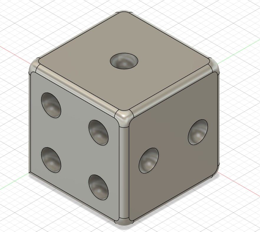 I then decided it was necesary to fillet all the edges of the dice so it wouldn't look so pointy and be a possible hazard to everyone. With this, it looked finished and polished and ready for rolling.
