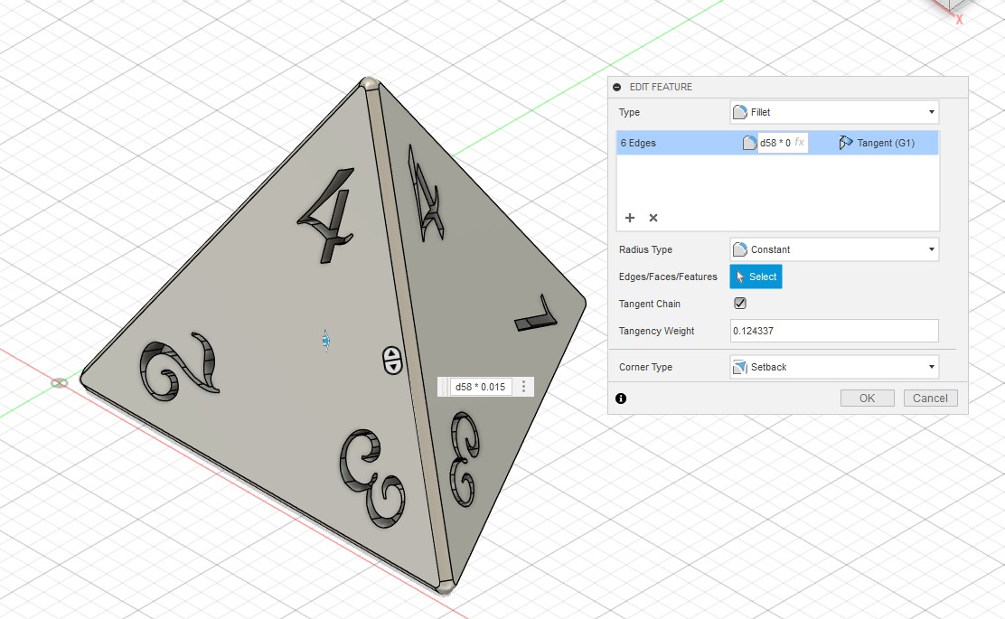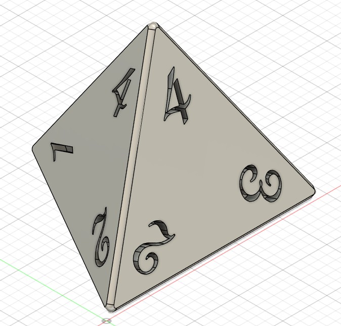 I finished this one off with fillets as well on the edges. No one wants to get stabbed by a 4 sided die.
