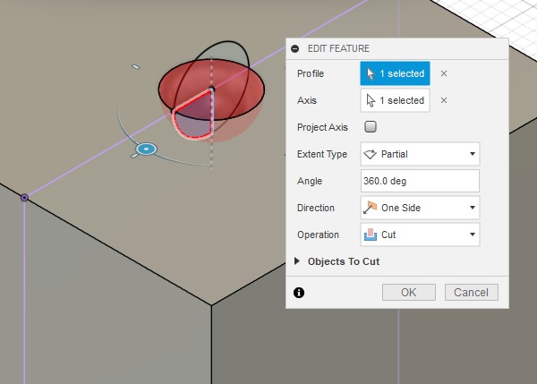 While this all leaves uss with a cube that has all 6 sides, it is still kind of sad looking. The first hole was a true sphere, but the rest were sad cylinders. That's when I realized I could do something about those features. I decided to use a fillet in all of them, carefully choosing the lower ring of the cylinder and bringing it in. This made all the holes look just like the first one, at a fraction of the time and effort spent revolving them.