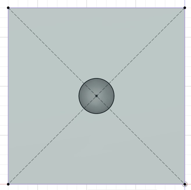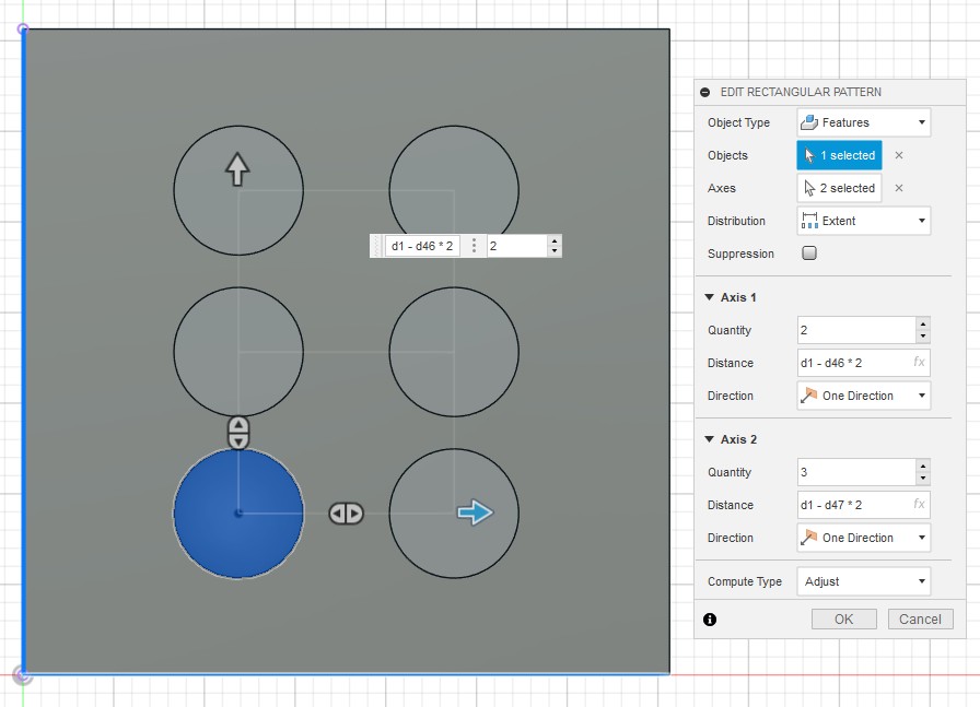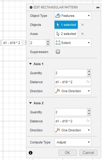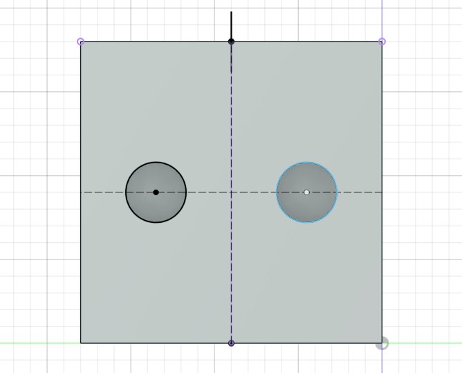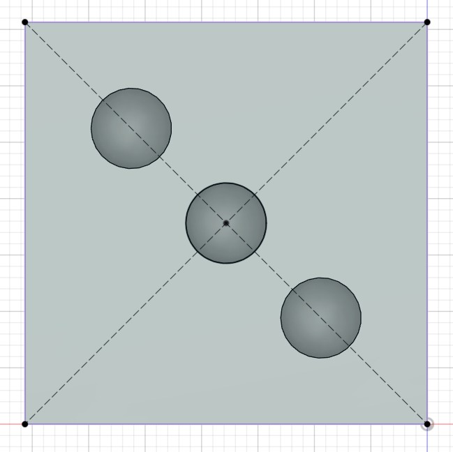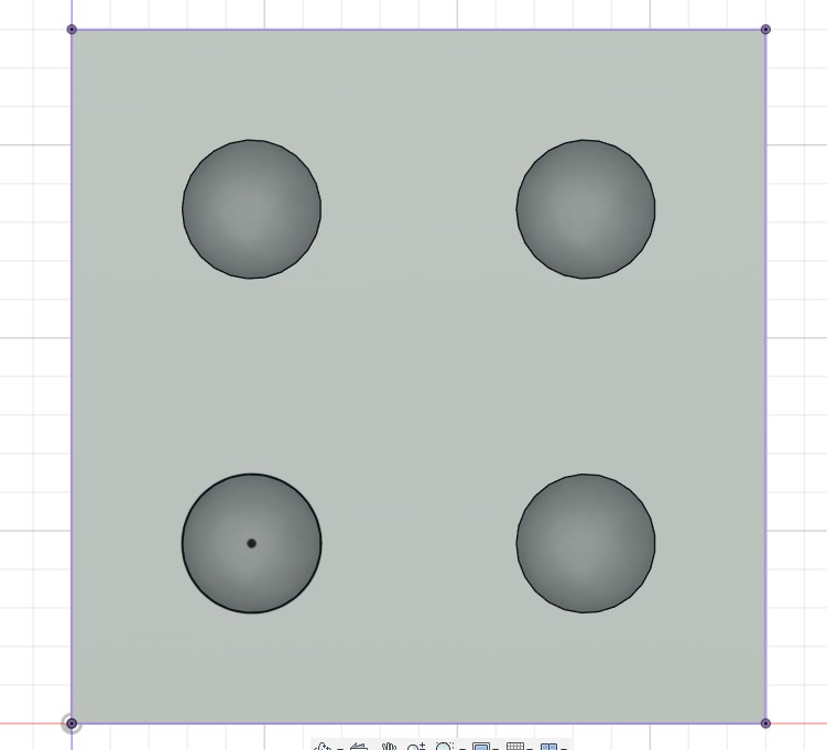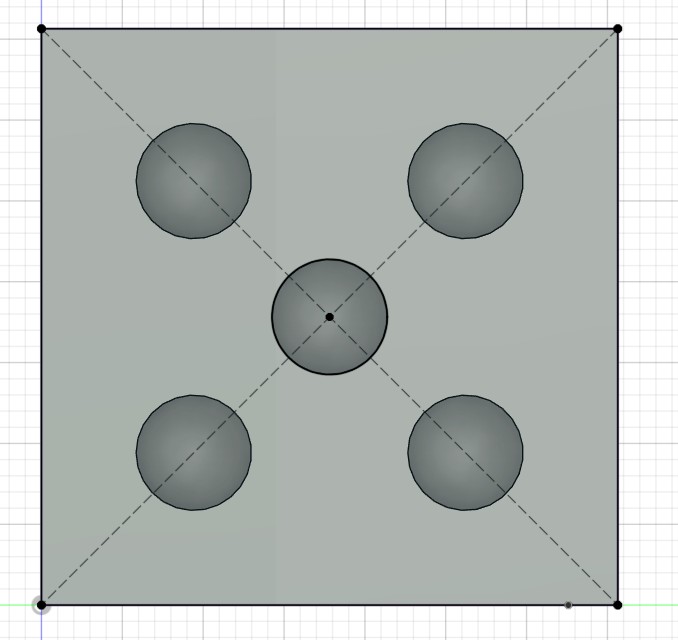 With the 1 in the top and the 2 in the right done, I checked online which faces normally are next to each to the dice. I switched to the back where the four goes. I created a sketch on the face, made a circle in the corner, and dug it out using the same method I described before. To make the other three, I used rectangular pattern with 2 and 2 to make sure we ended up with all 4 holes.