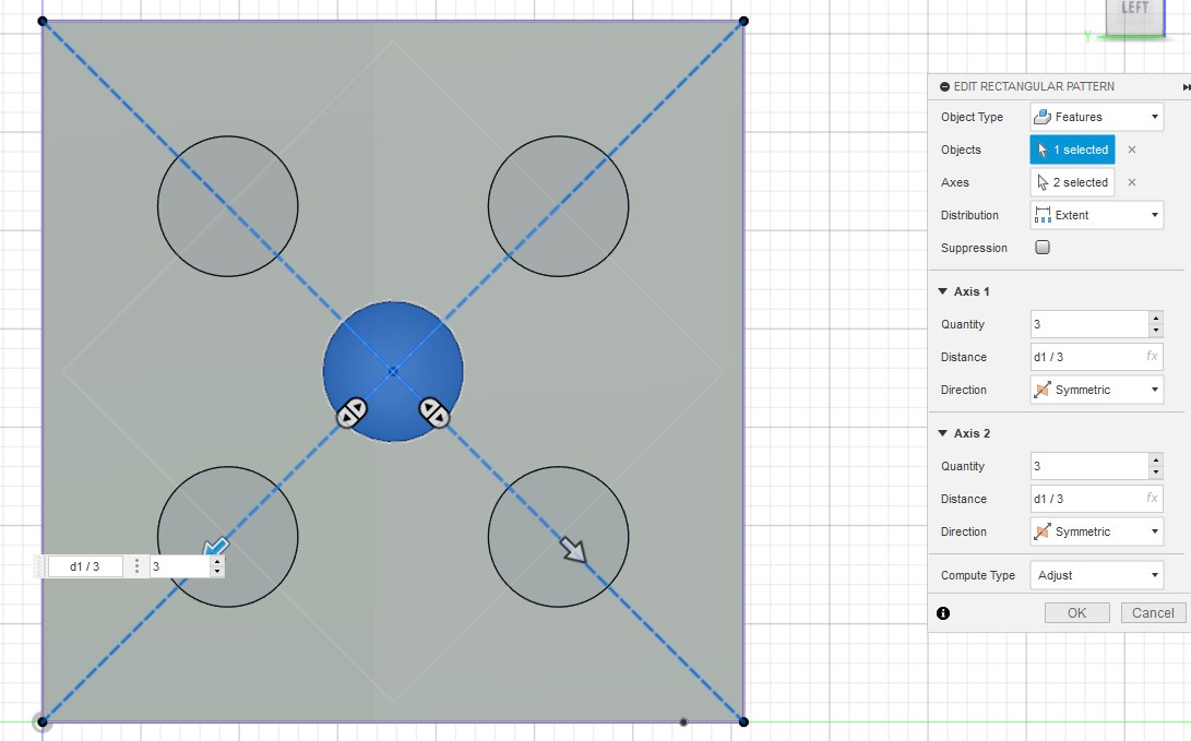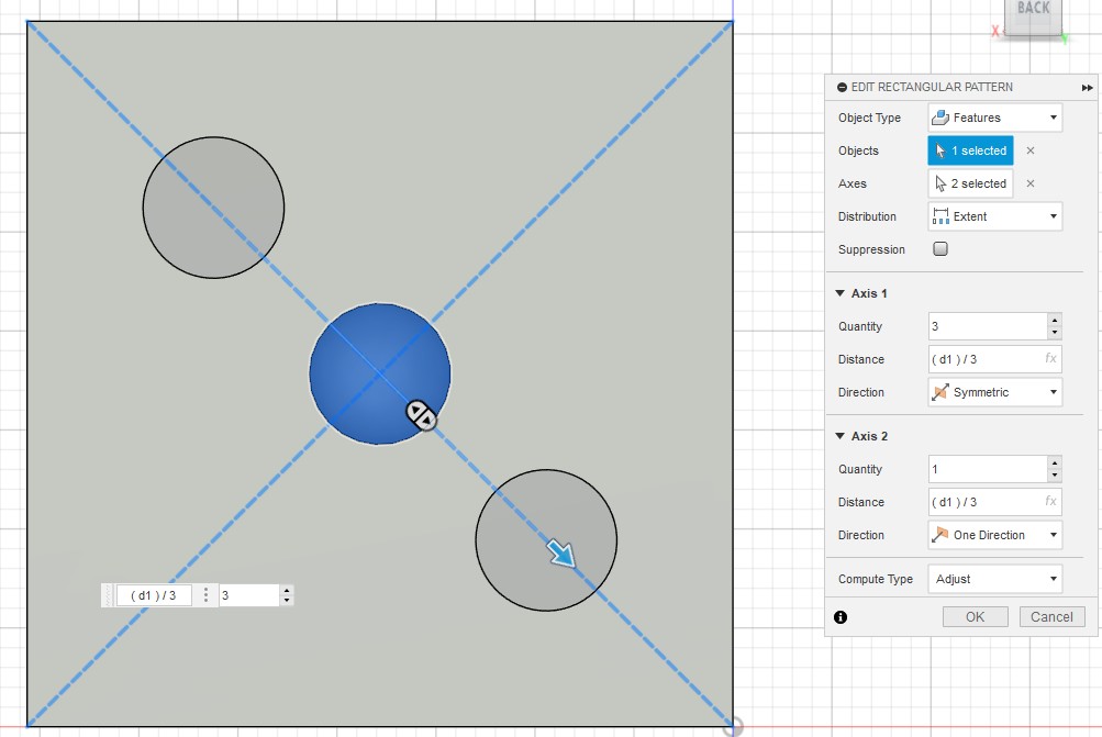 Then I turned to the front, to create a new circle in the center and use a rectangular pattern in a diagonal to make the other two holes an have a the three on the dice.