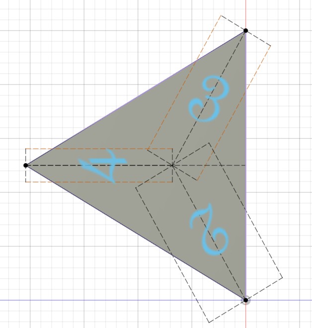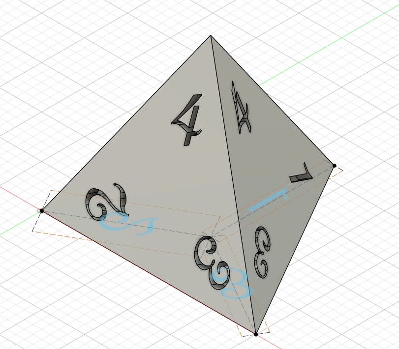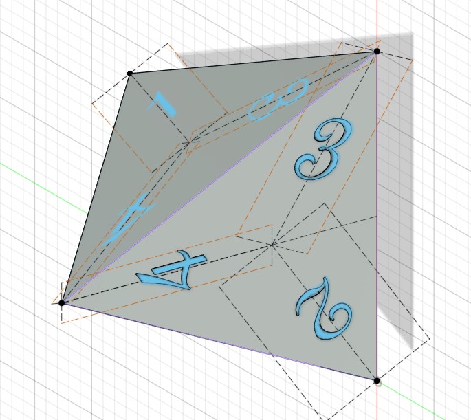 Having the tilted faces of the pyramids make it much easier to just make a new sketch on each face. Then I could use the text tool to make each number. I could use the normal sketch tools to align the number's bounding boxes to the lines traced to the middle of the pyramid. This allowed to have each number facing the right way when the dice rolled. Once the text was in place, I only had to extrude in the numbers. This was the same for the faces, the only difference was which number went to which face, to make sure they all aligned with the same nuber pointing at each corner.