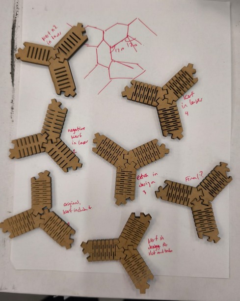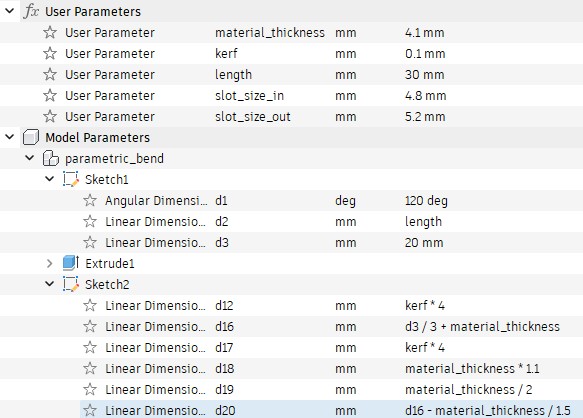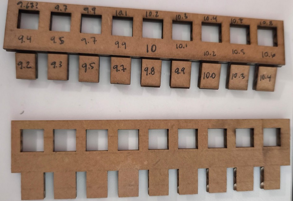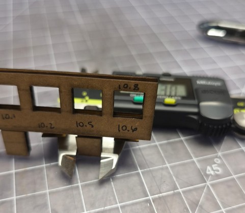 For the kerf test, I made a design that was just a series of square holes and squate tabs. The middle square and tab was 10mm, and the size increased towards the right and decreased towards the left. The idea was to measure the cut vs the real value and see which tabs fit which holes to confirm.