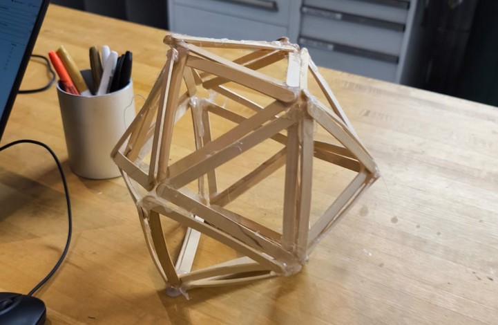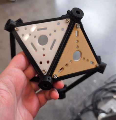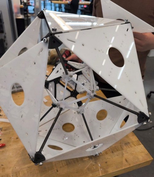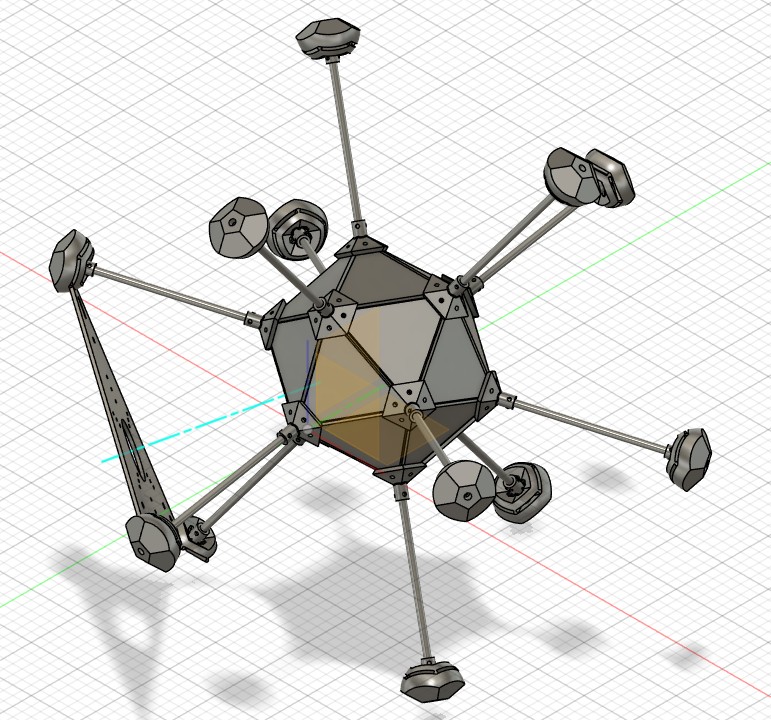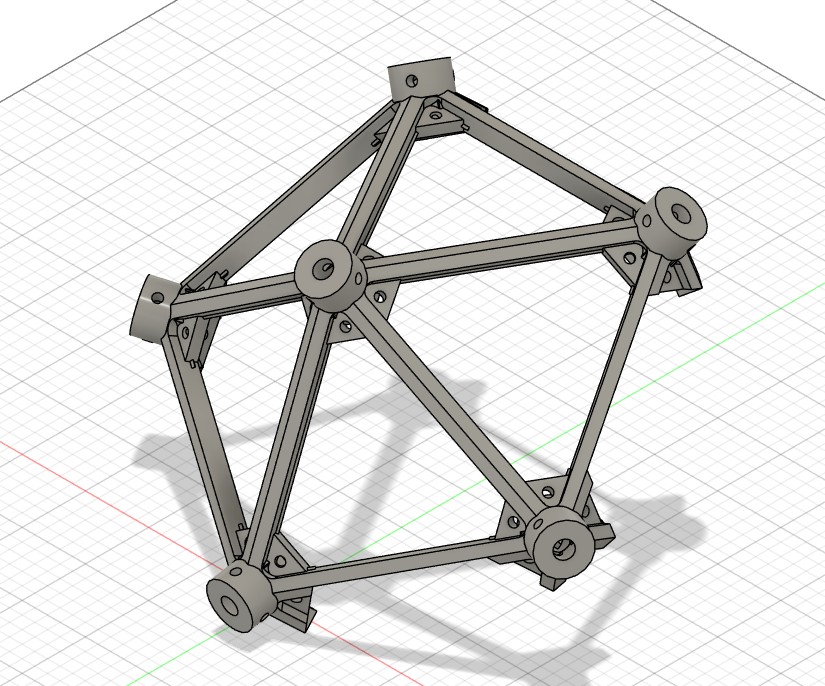 After printing the new vertices, we managed to assemble the whole outer structure without much trouble. It was way more stable and easier to assemble. However, every team was having issues with this vision. The electronics team needed something different to mount on, the mechanism subteam needed a unit that could be more easily assembled for their simulation. Alfonso told us our issue was thinking of it in terms of outside to inside. This cause a complete overhaul of the design, starting again from scratch.