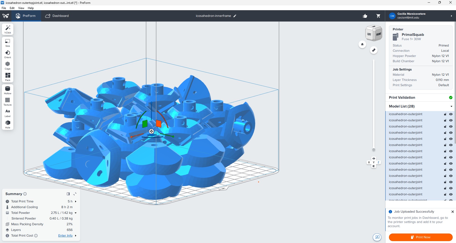 I printed the outer joins and the inner frames using the SLS Fuse 30W + machine. This fuses nylon together using a laser. its very fun.