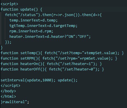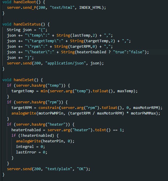 The functions to handle basically do as follows. Handles root just becomes the main menu, sort of starting point for the page. The handle status packages the information into a json file so it can be read by a browser. The handle set just makes sure it is in the format the webpage expects it.