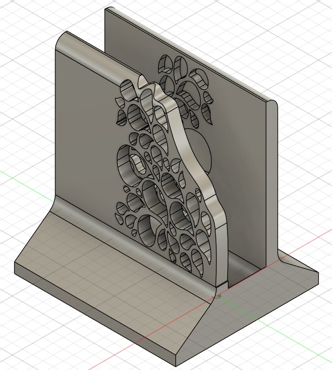 Then I decided this was boring and actually easy to do in other manufacturing methods. So I decided to give it some sparkle and make a pattern on it. I got some drop image from Shutterstuck, captured part of the pattern using Inkscape, inverted it with some added shape, and exported it as a SVG. I then uploaded this SVG into fusion, where I used it as a source sketch to reshape my original dock design. Behold: