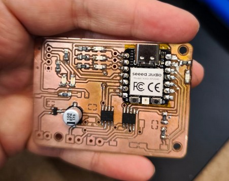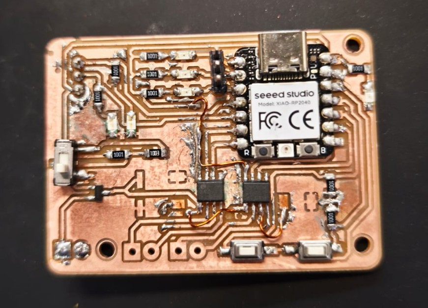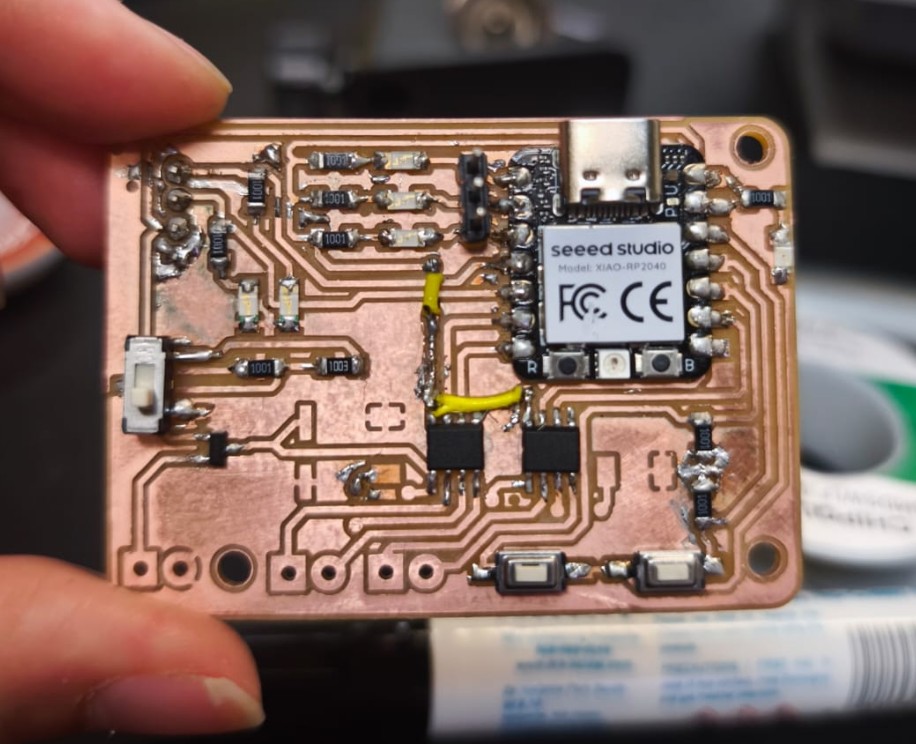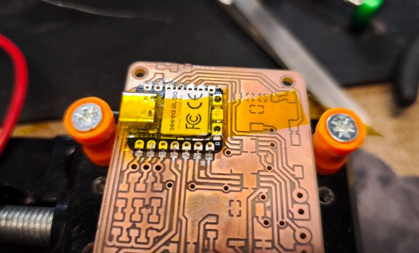 With the microcontroller out of the way, I checked the pads both on the board and on the XIAO. I found they did not short at all. This confirmed it was my soldering that was shorting the boards. So I soldered again super carefully. And it shorted again. So I desoldered it again. And this time it looked very burnt, so i thought it would be best to remill it. Since I was remilling it, I should fix the vias and make it easier to solder the next time around.