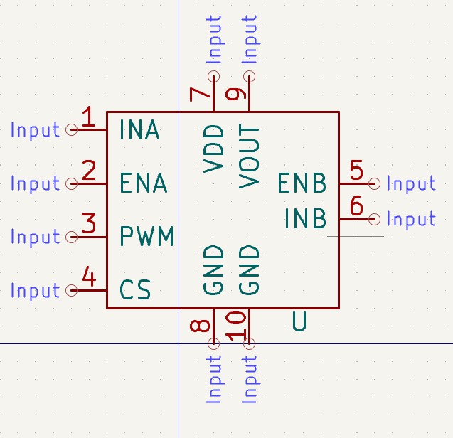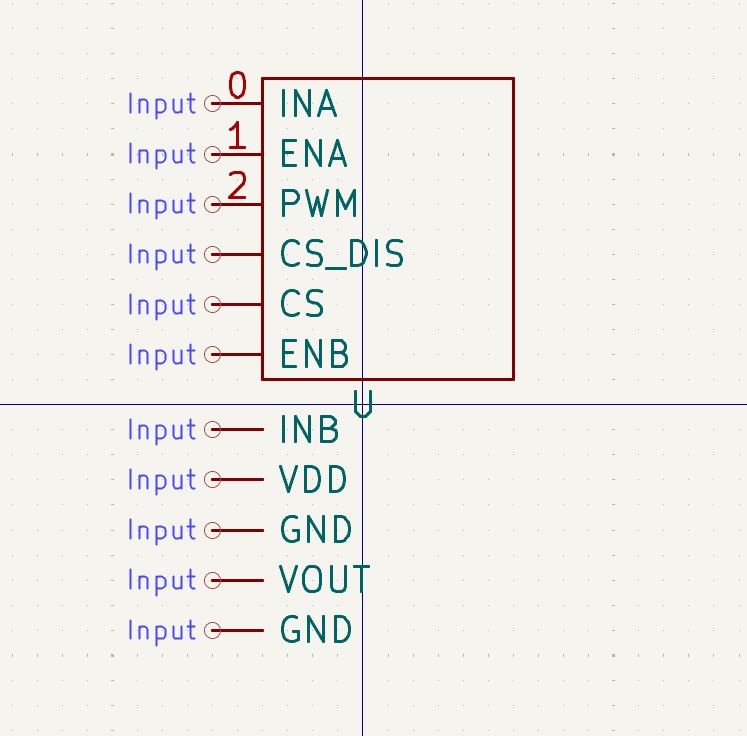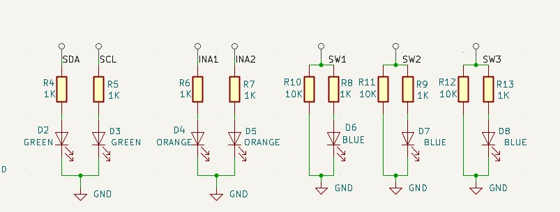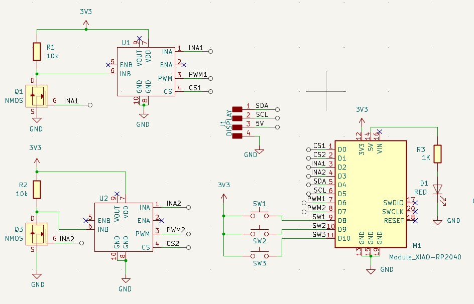 With the schematic symbol and footprint linked, I got to work making the schematic. Using the driver information, I surmised that CS - current sense- is a pin that can be read as an analog signal to indicate current. INA and INB indicate rotation direction, and because I did not have enough pins and I knew they should always be opposites, I did an inverse logic with an N channel MOSFET. When the signal from INA is up, then INB would be down. The PWM can be from any digital pin. And finally, I wanted a screen to be able to monitor the motors. For that, I used a OLED Display 128 x 32. This communicate sin I2C, so I needed the DA and SCL pins free. This left me with three pins available, so I added switches to be able to navigate the display and change speeds.
