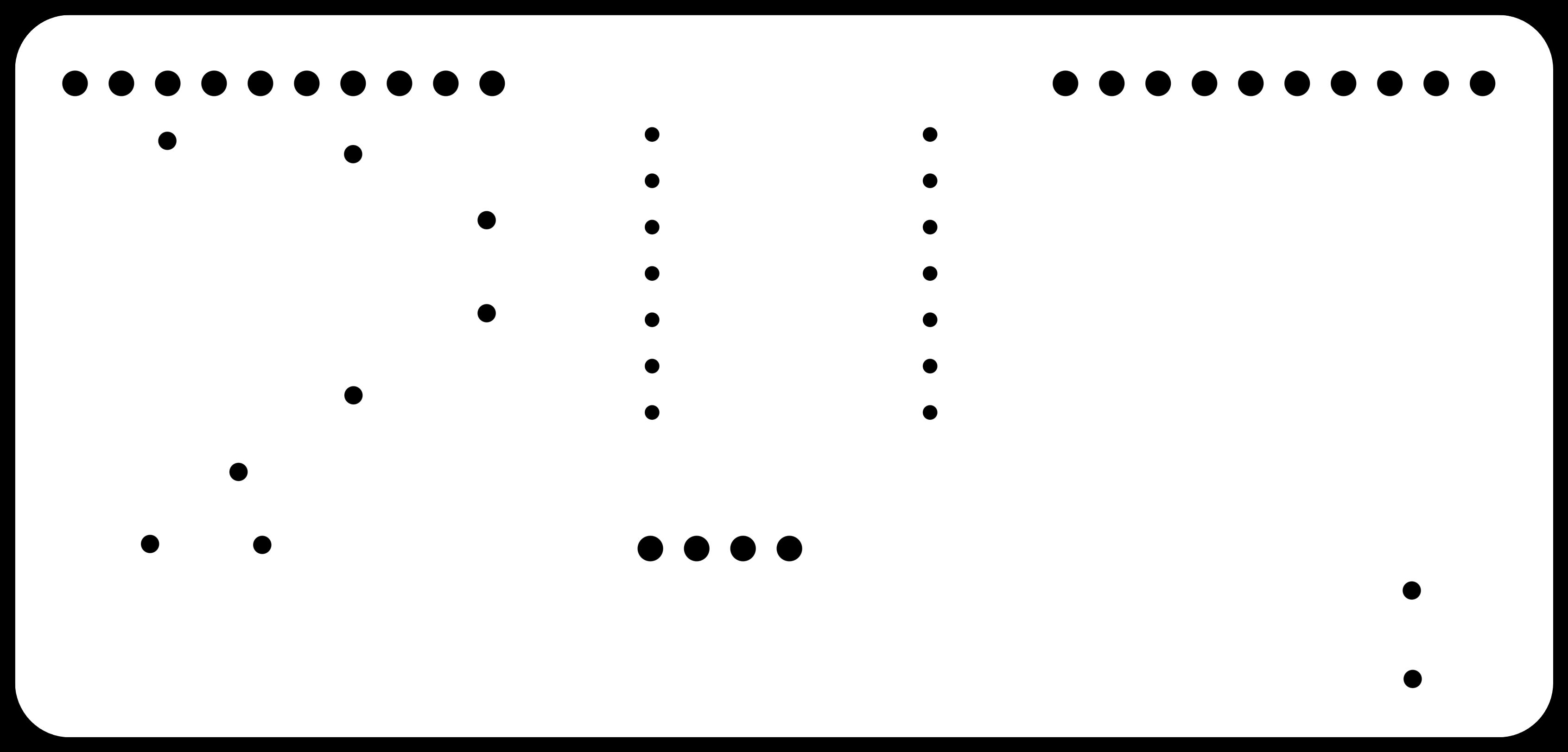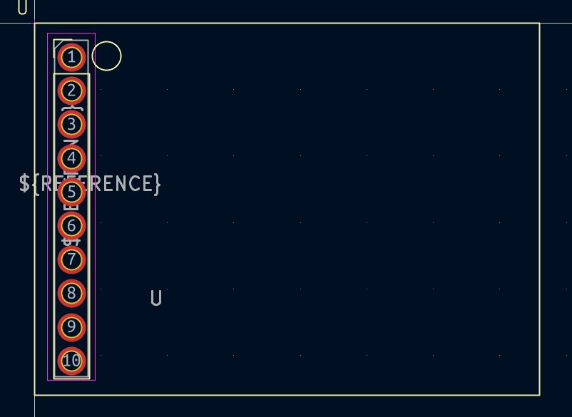 For the footprint, I made a rectangle with the right dimensions in the top silkscreen to illustrate where the driver would sit. Then I used a pinheader, slightly modified by adding two more pins as the longes one I could find was 8. I just changed the pad numbers and verified they were on the right distance from each other and also the edge of the rectangle I had just created. Behold.