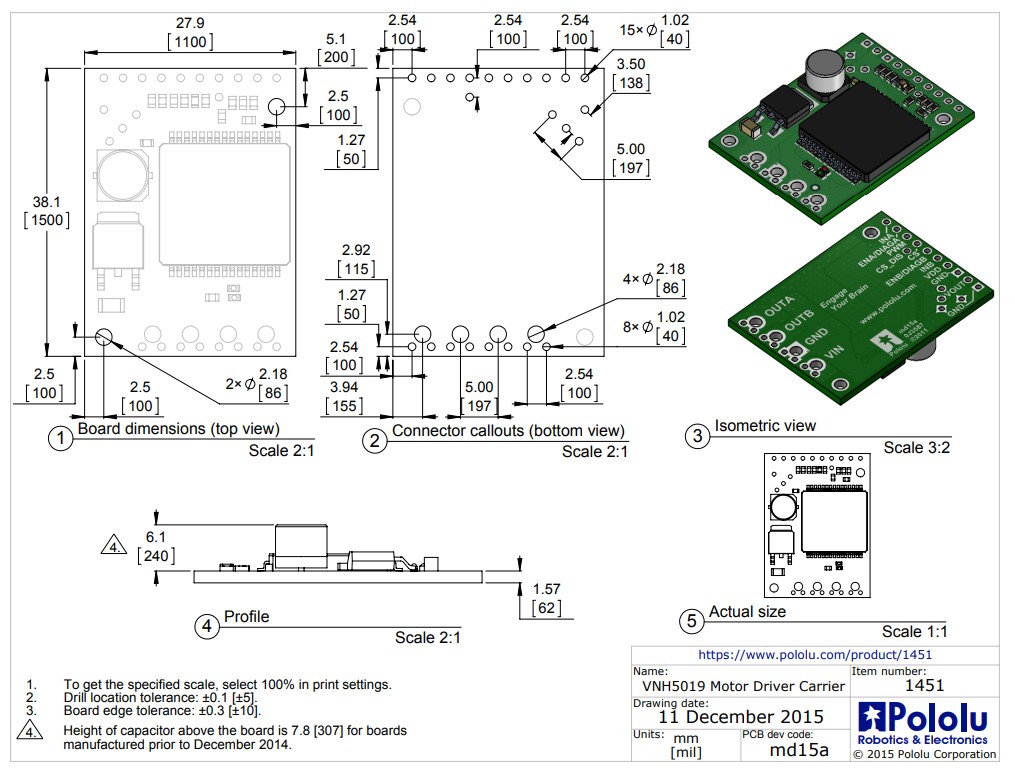 I decided to make a schematic symbol and footprint for the Pololu driver, mostly so my board didnt have the driver hanging off in the air. If I get time, I would love to design a case for this one, so I want it all to be neat. So for starters, I needed the info on the driver, which Pololu kindly provides.
