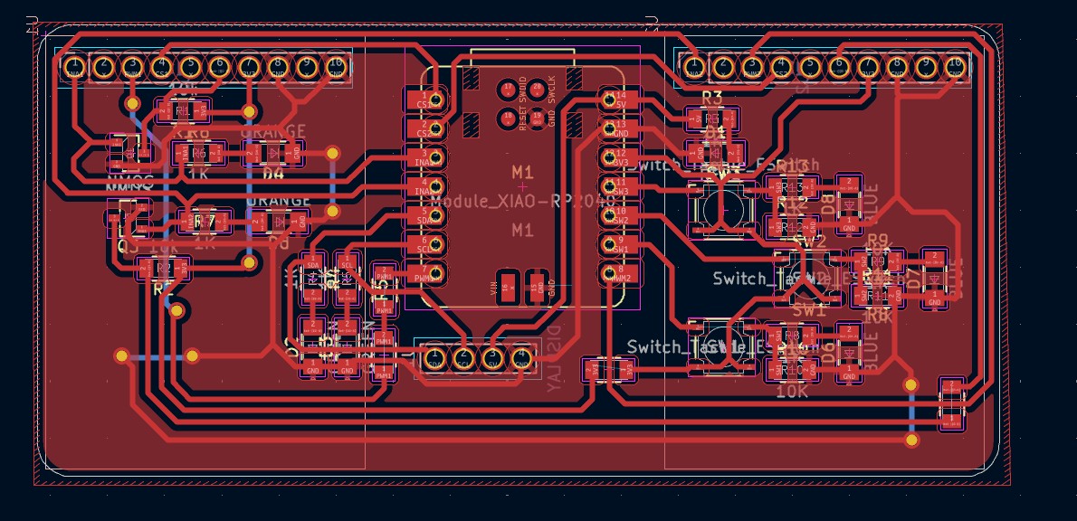 The BOM is as follows: 1 Seeed Studio Xiao RP2040 5 10k resistors 8 1k resistors 3 pushbuttons ( note the footprint in the fab library do not match the ones in the lab) 1 red LED 3 Orange LED 2 Green LED 2 Blue LED 2 10 pin female header 1 4 pin female header Some wires for the jumpers. Also needed, but not on the board directly: 2 Pololu VNH5019 2 Pololu 12v Motors 1 12V adapter