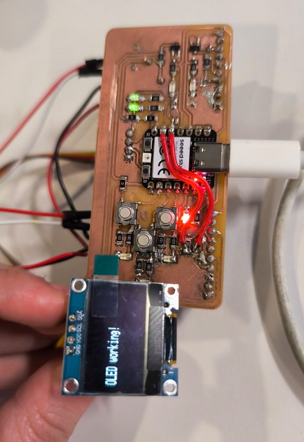 I first ran an example code for the Display. Here is when I noticed the display does not work. Going back, I realized I forgot the pull up resistors for the SDA and SCL. This required some surgery- I found a 3V3 line where I could solder the resistors, and cut up the ground plane around it to have space to wire a made up SDA and SCL pad. It was awful and timeconsuming and it looks very not pretty. Ideally, I would have machined another board, but there were other people using the machine and sodlering the entire board again would take much longer, or so I keep telling myself. The janky solution worked! So the OLED is runnnig, the buttons are pushing, and now on to using the H bridges.