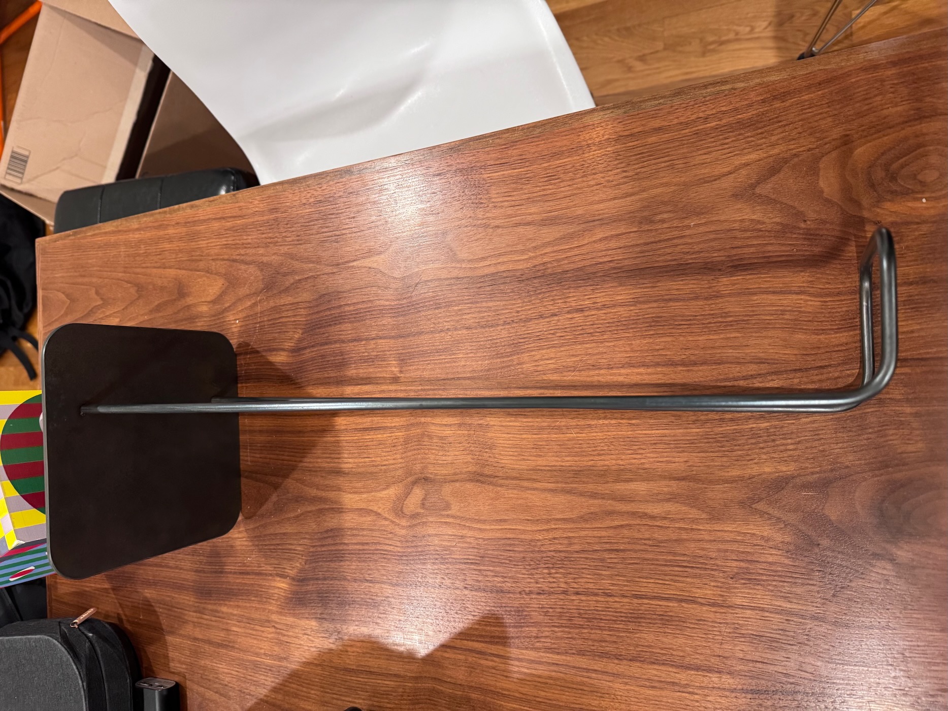 I first created a 3D model of the bookholder in Fusion to get a sense of proportions for the steel rod and plate. I ended up deciding on a \(7' \times 7'\) plate and a 20 inch long steel frame with a 3 inch foot. The diameter of the wire I used was around 0.255 inches. Two changes I made from the original design was to round the corners of the plate and to cut out holes for the frame on the plate and weld them together instead of using screw fasteners.
