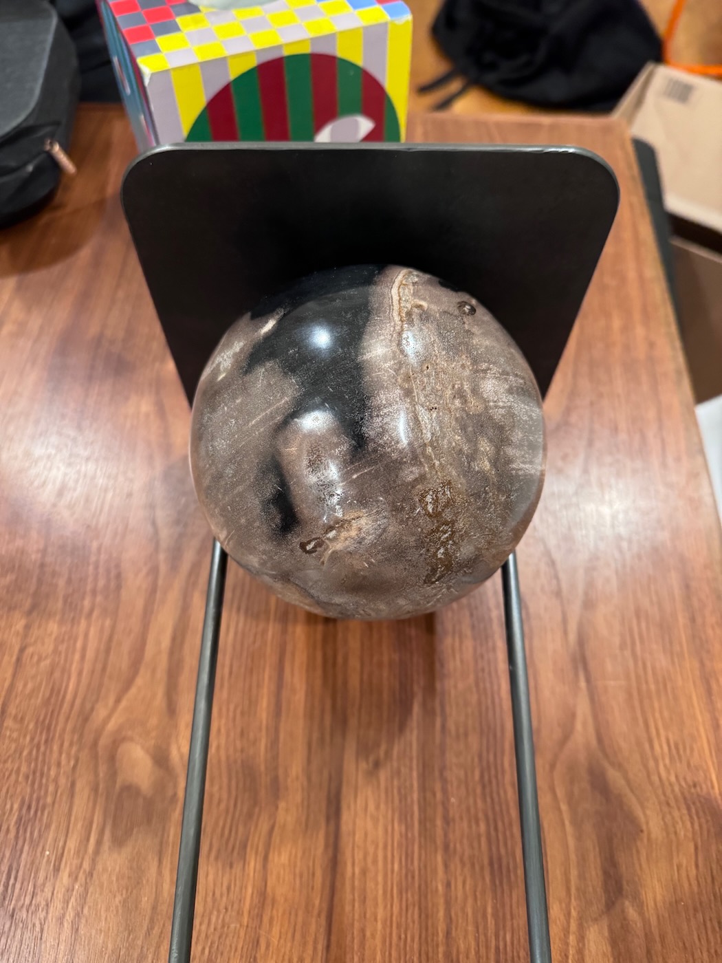 Instead of solid hard wood, I ordered a petrified wood ball (feels like stone and is much heavier) that measured around 5.25 inches in diameter and weighs almost 7 lbs.