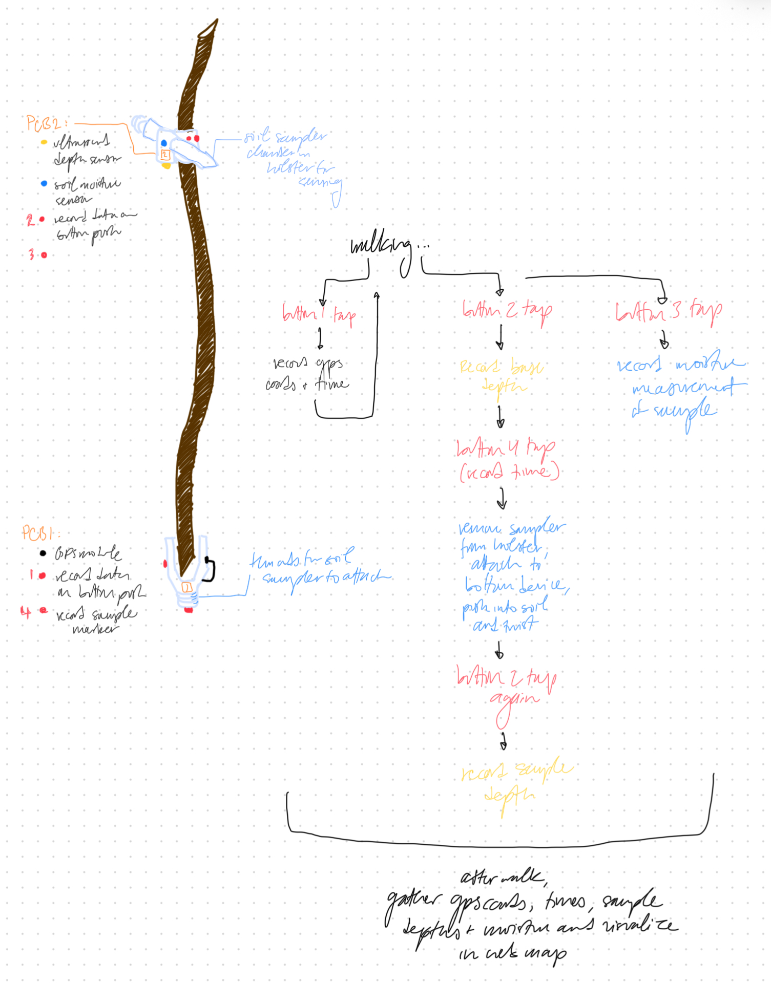 Based on my initial designs and the insight from Anthony that a LiDAR or Ultrasound depth sensor would be a good choice (and would therefore need to be located at the top of the stick, while the sensors and sampling equipment are at the bottom), I believe the device will work best as two components: an upper device (with most of the electronics and the depth sensor) and a lower device (with the sampling spade and moisture sensing).