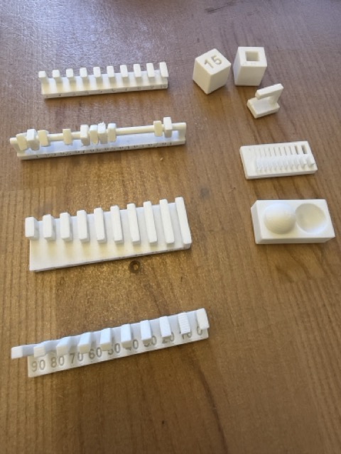For the group assignment, we printed a set of test objects as kindly summarized by Neil under "design rules" in the class page for this week. We used PLA for the tests. These objects test attributes of the printer's limitations including the following: