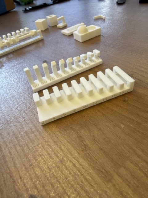 : the minimum thickness of a vertical wall achievable by the nozzle (also printed with tests for the minimum slot size of linear holes in solid printed area).