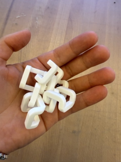 In future versions, I would try to push the limits of how small and close together the links would be. In the interest of time this week I wanted to avoid any potential challenges with the abilities of the printer but I believe that smaller, more circular, and closer together links would make for a smoother and more unified whole.