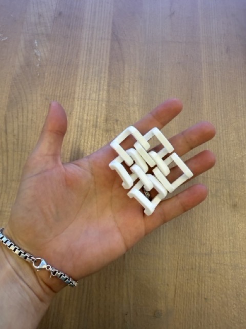 However, as I suspected the links were too big and far apart, making them prone to collapsing onto one another and creating more of a cluster than a surface. While this is a fun puzzle to rearrange, it is not what I ultimately wanted: