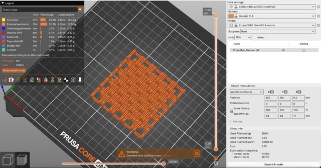 With this in mind, I revised the design by changing parameters to achieve more, smaller, rounder, closer-together links in the chainmail and re-sliced: