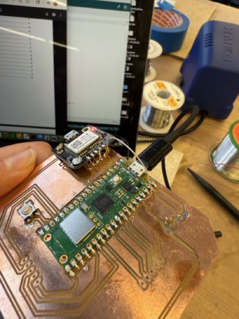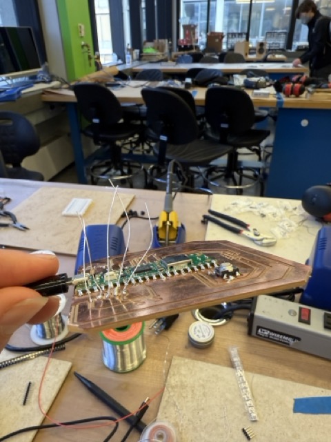 Once these extra wires were in place, I soldered the microcontroller onto them and attached its receiver to the clip-in pin.
