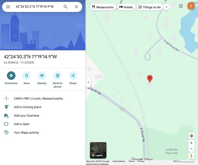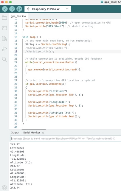 The output to the serial monitor changed constantly within an error of about 0.00001' in each direction, indicating that there are some limitations to its precision (since I was not moving). However, I checked the coordinates it gave in Google Maps and concluded that it indeed had found my house: