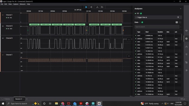 In the improved visualization, the top two channels are I2C communication between the main microcontroller and the sensor, and the white channel below them is the analog capacitance signal. Thank you Ben!