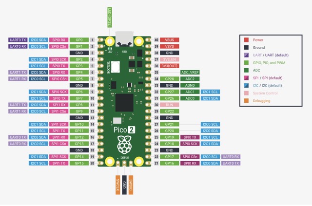As I set about this work, I found it important to have my Pico W pinout, PCB schematic, and PCB print visualization handy so that I could remember which pin corresponded to which function. Here they are (for my own future convenience also):
