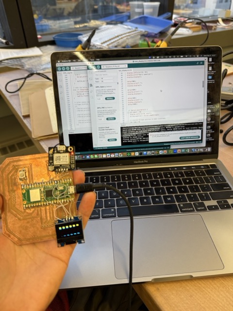 This week I finally started to feel confident running my Arduino code-- not sure why it took me so long to get this right (maybe because it messes up my monitor every time I have to plug and unplug the PCB from my computer?) but in any case, here are the actual steps. I am not sure why this was never obvious in any of the resources I looked at: (1) holding BOOTSEL, plug the data/power cable of the PCB into the computer, (2) select "UF2 Board" as the "board" under "tools" in the Arduino IDE, (3) upload the sketch (4) SWITCH the "board" under "tools" to the one with "usbmodem1101" in the name. Now you can view output on the Serial Monitor or upload new code and debug as needed.