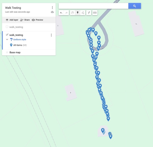 While I had hoped to make a device that would draw the shape of a path on the display, I felt that my display was too small this week to achieve something like this. I did test that strategy by dumping my GPS output to a CSV and reading that out to the Serial Monitor, then plotting it in Google Maps:
