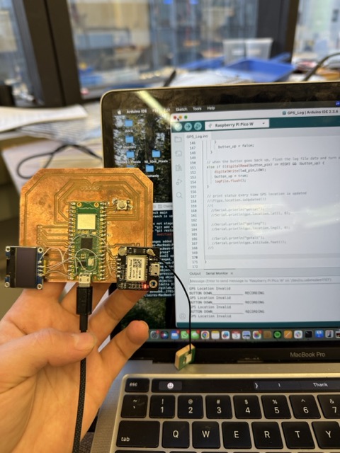 Seeing that the display worked, I tested the GPS again to make sure things were still in order, by loading my button pressing sketch. I had added to this some button outputs corresponding to writing data to flash memory, explained more under my Final Project.