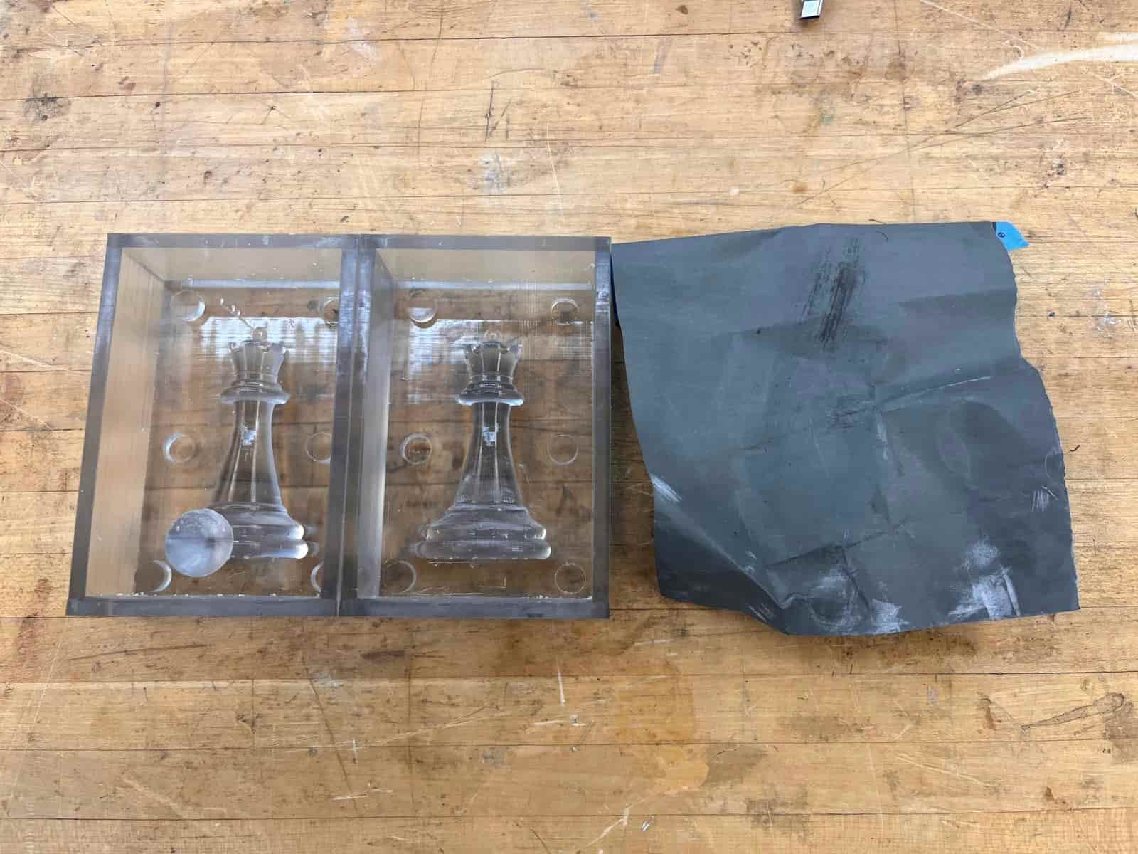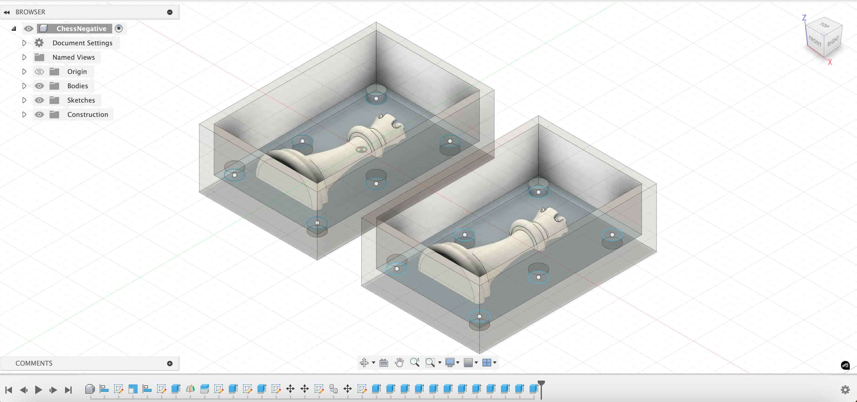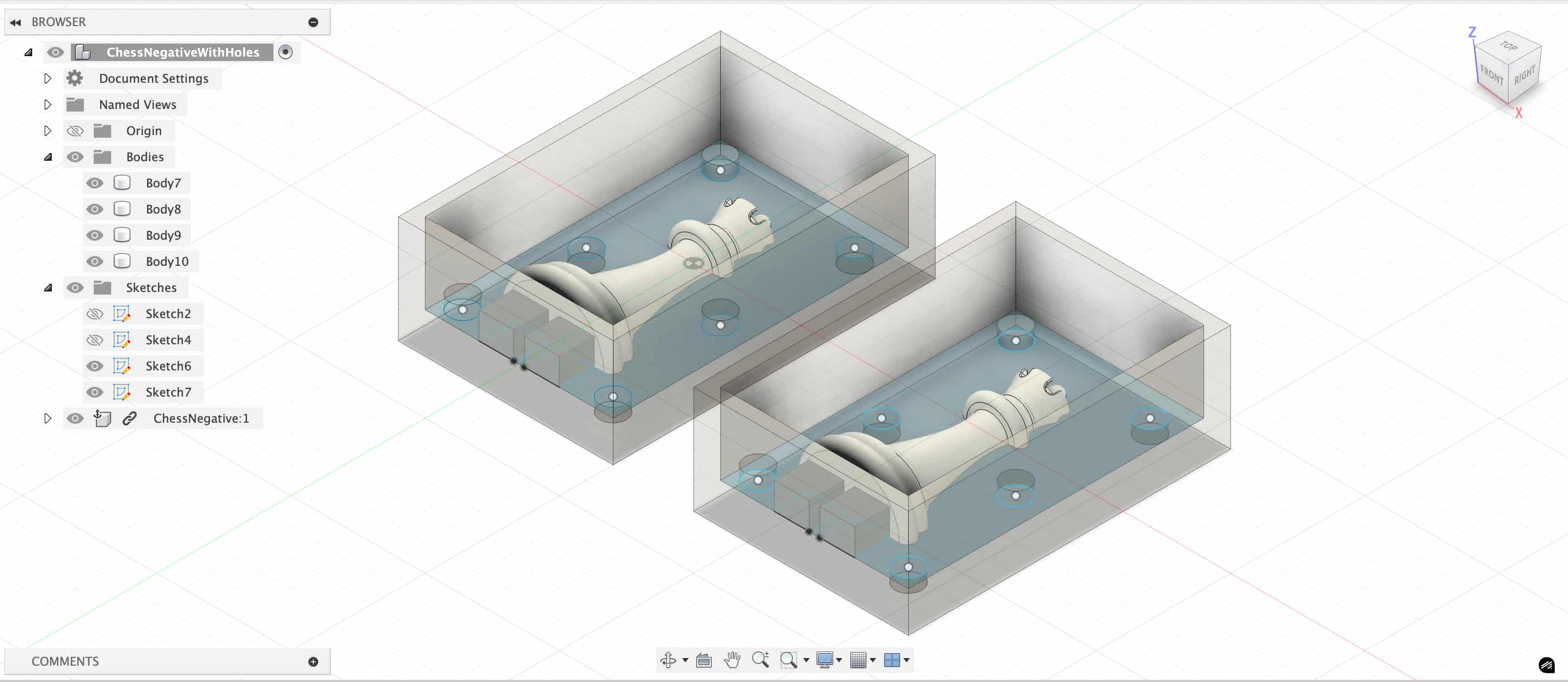 I first used the split body function to split my chess model in half. Then, I created the mold box around each half of my model. I also added registration holes to help each side of my negative mold fit together.