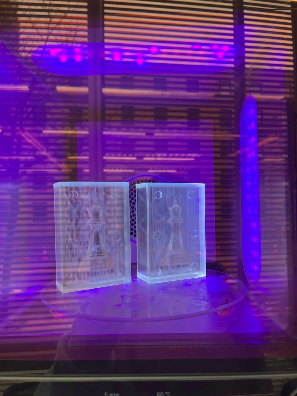 Since I printed mine vertically, there's more support to hold my chess pieces together. It was hard to remove the supports after I cured the model as everything hardened. After removing the supports, I also noticed some support was still stuck to the chess piece, which went against the "every print should be perfect" principle. Here's what my print looks like: