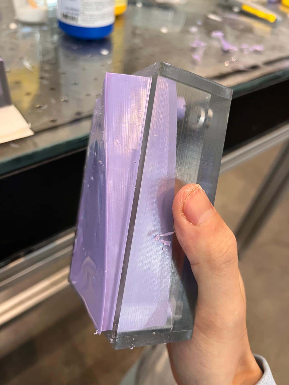 When pouring the resin into my mold, I noticed that the pour hole I designed was too small and the inflow speed was way too slow. I srambled around to try to drill a bigger hole to get the casting material in faster. However, the epoxy resin only has a pot life of 30 minutes, so it soon hardened and I couldn't do much to save it.