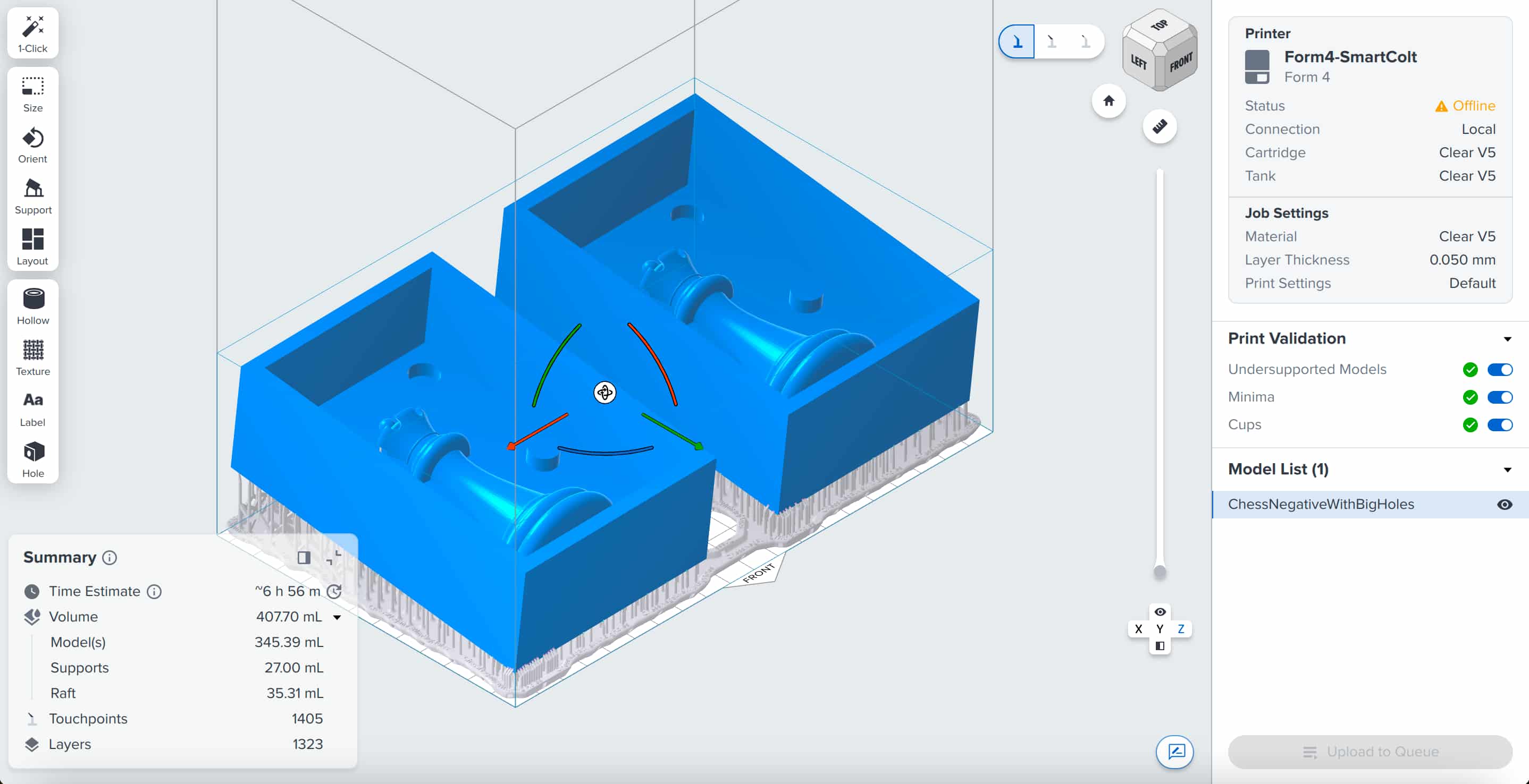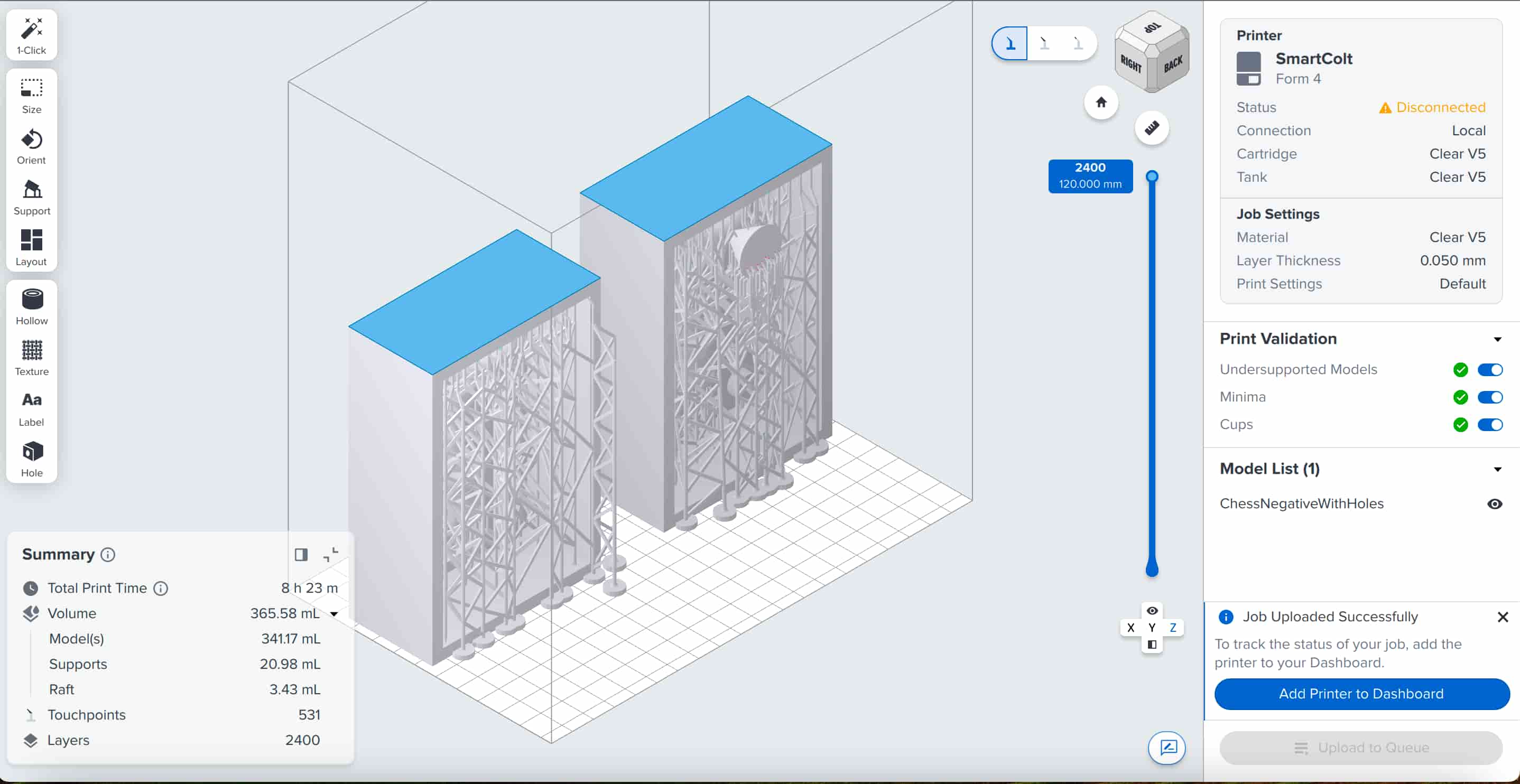 Using Preform's one click print setup, I noticed a warning that cup was detected because my box design could lead to water trapped during the print. I didn't want to add a hole and then glue it later on, so I made my print vertical. I am also using the Formlab's SLA printer with Clear V5 material.