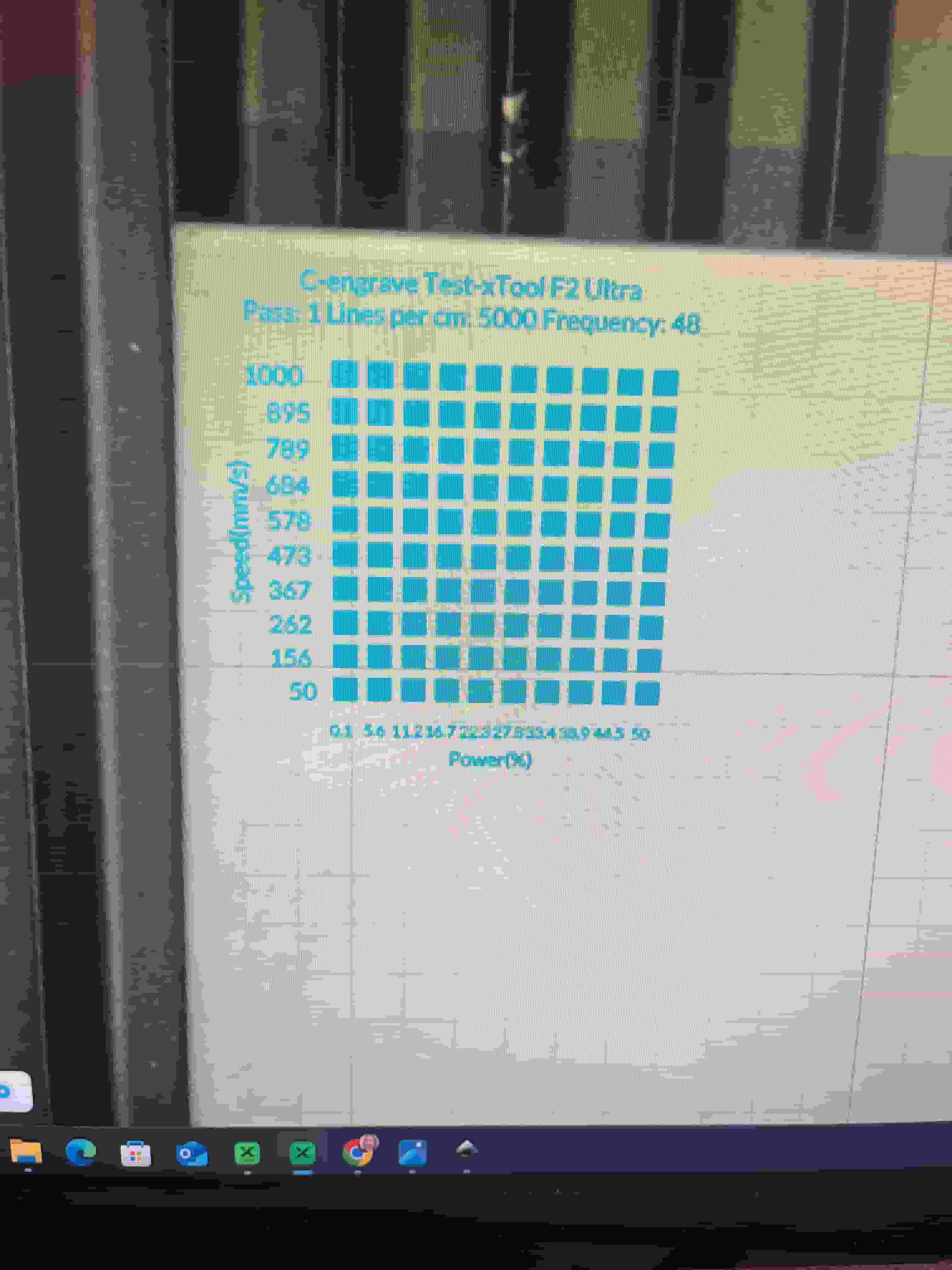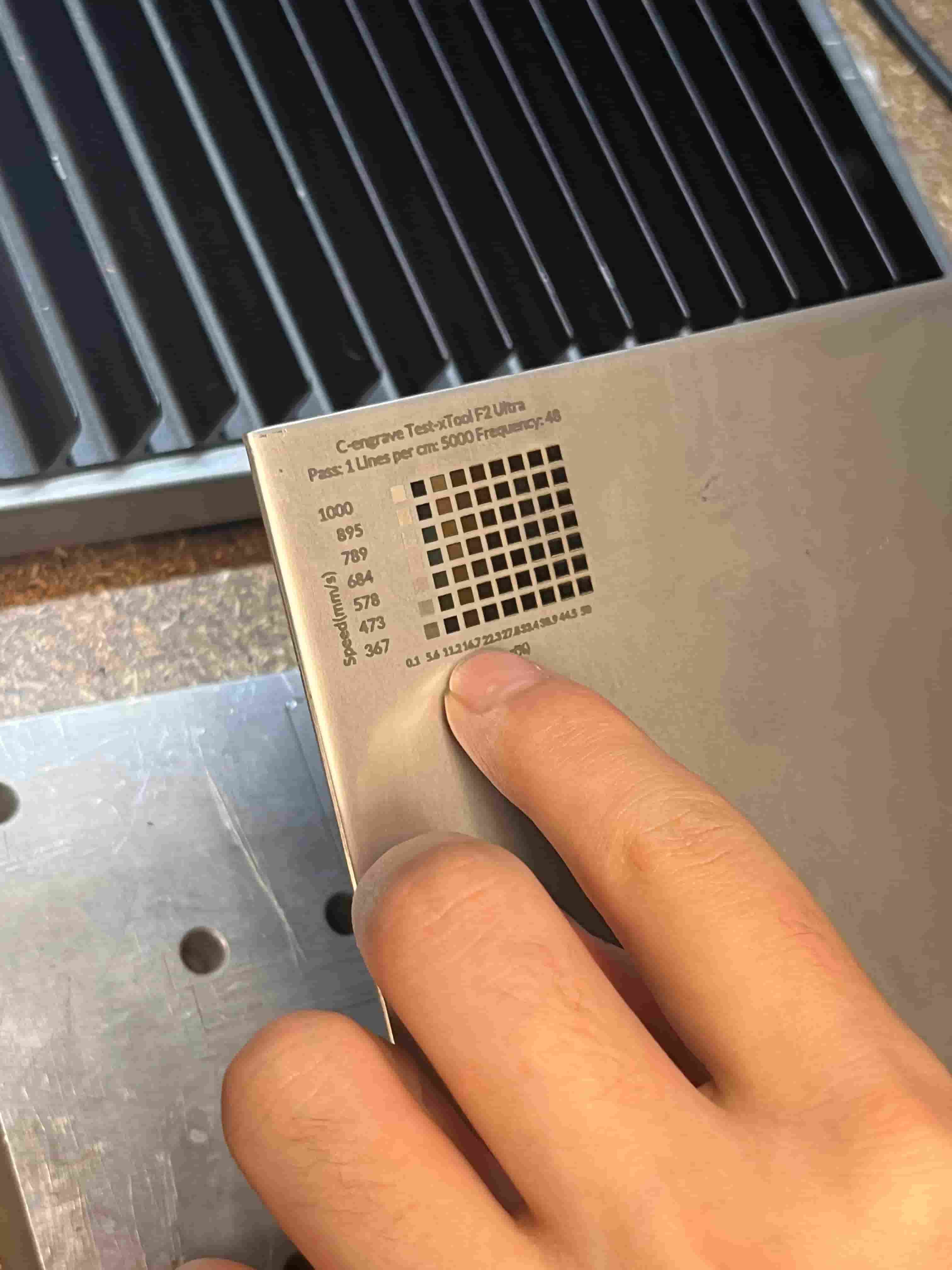 I first tested a few different confiruations of the laser cutter MOPA IR's speed, power, frequency, and lines per cm using the material test array feature in XTool to quickly generate the test grid.