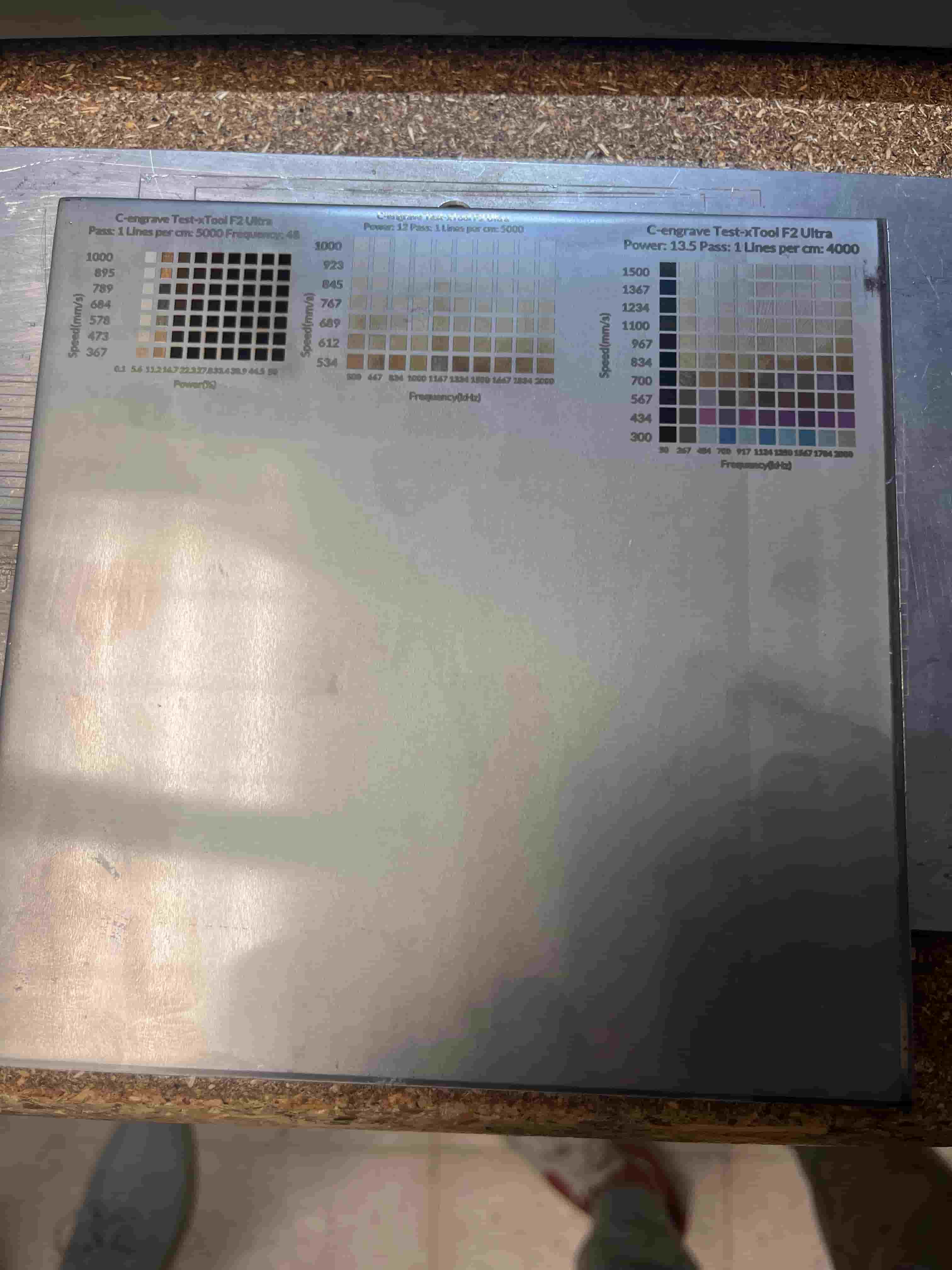 The result was not very optimal, with mostly black colors and the lower power producing some bronze and white colors. Thus, for the second try, we went with the lower power setting of 12, and this time we are removing some of the lower speed for faster turnover time. For speed settings, we went with max 1000, min 300, 10 rows, and 0.8 spacing; for frequency, we went with max 2000, min 500, 10 columns, and 0.8 spacing.
