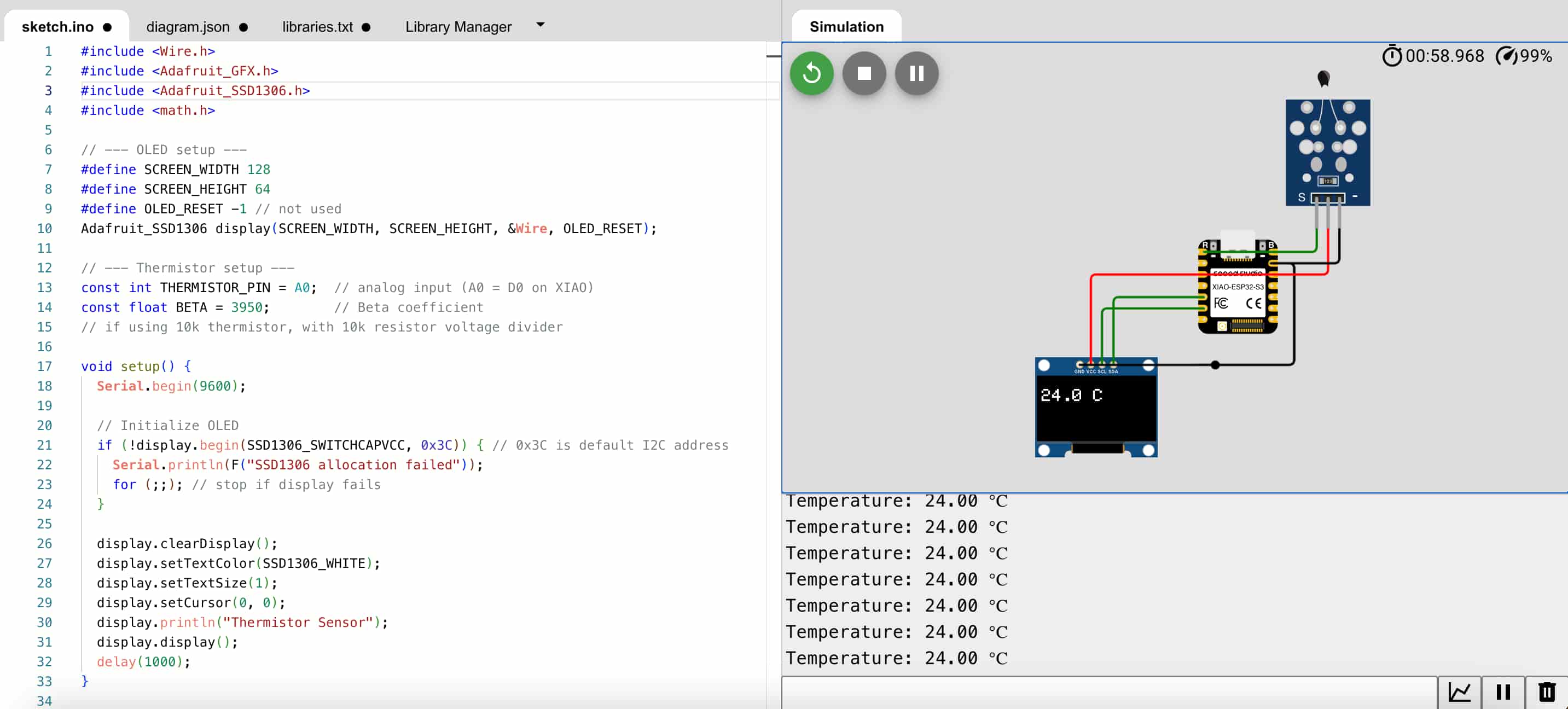I came back after finishing week 6 to complete the simulation. I used the final simple circuit I designed using the NTC Thermoresistor and the OLED Screen. I successfully read the temperature from the sensor and displayed the temperature on the screen.