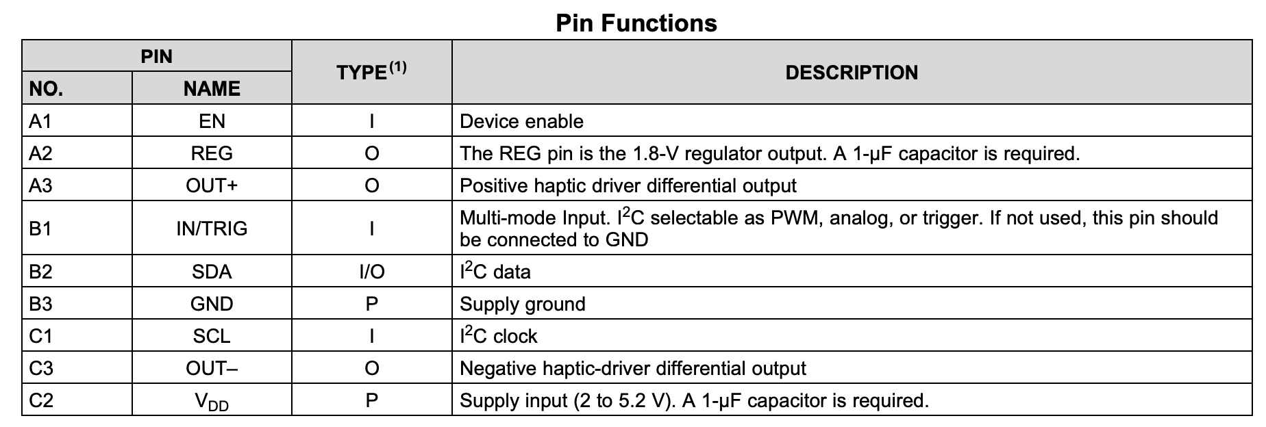 Another example is the DRV2605 haptics driver. The pin function table told me to add a 1uF capacitor to the VDD pin, as well as using the REG pin for a 1.8-V regulator output with 1uF capacitor.