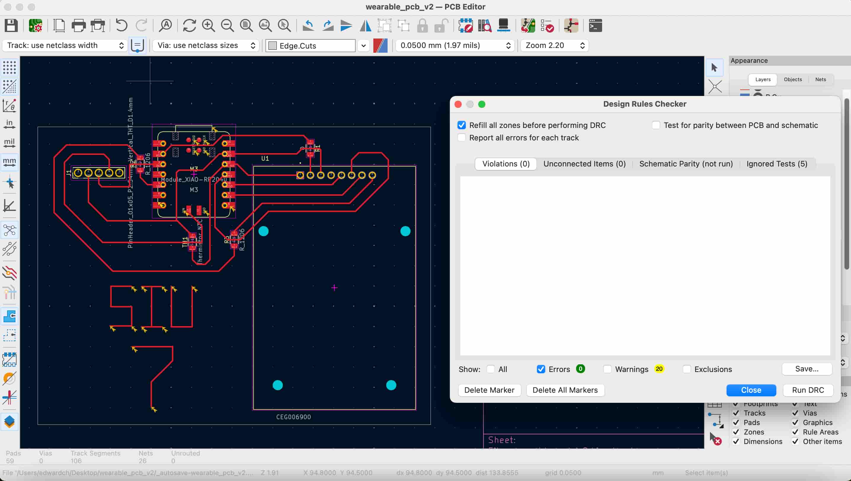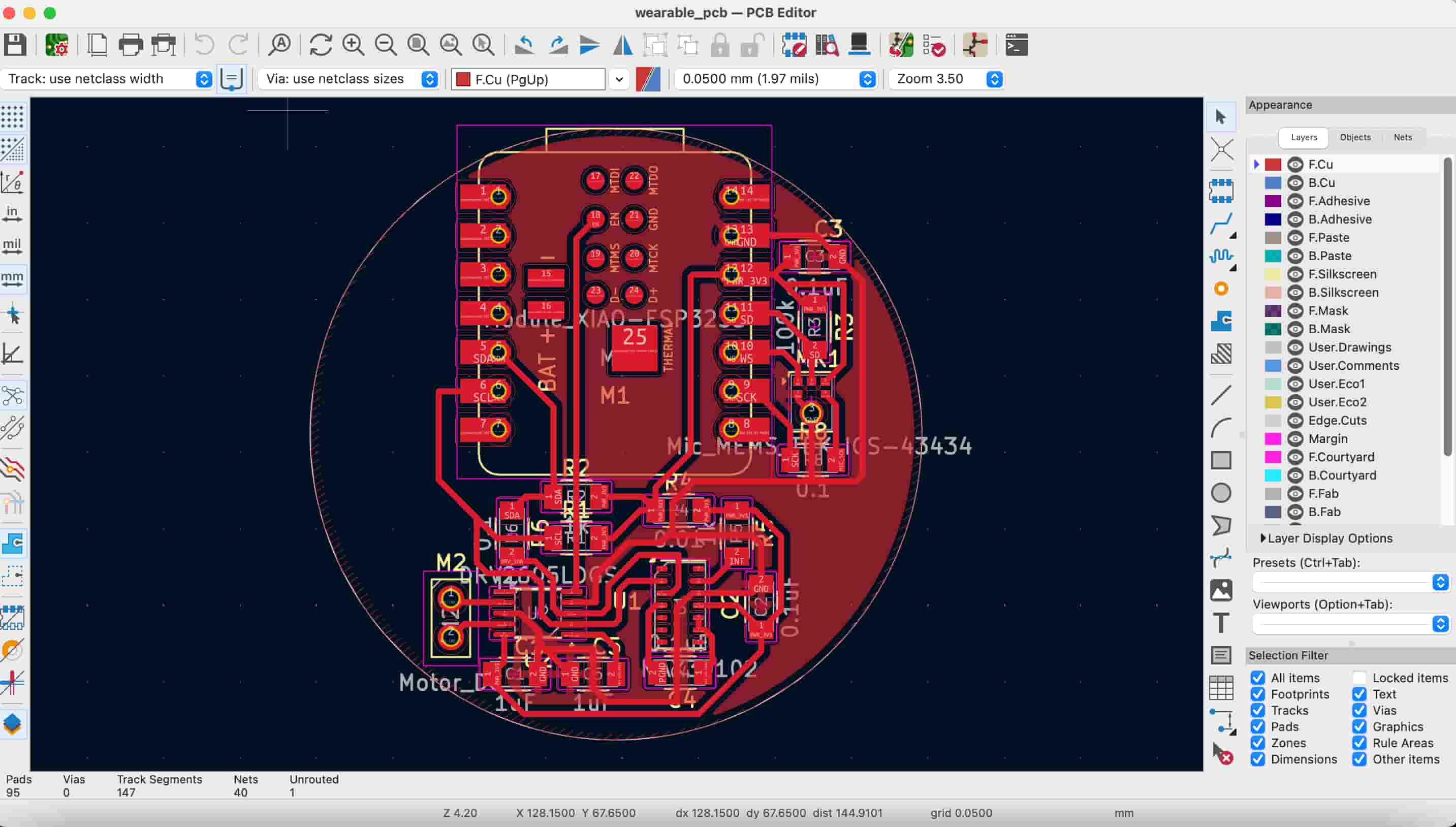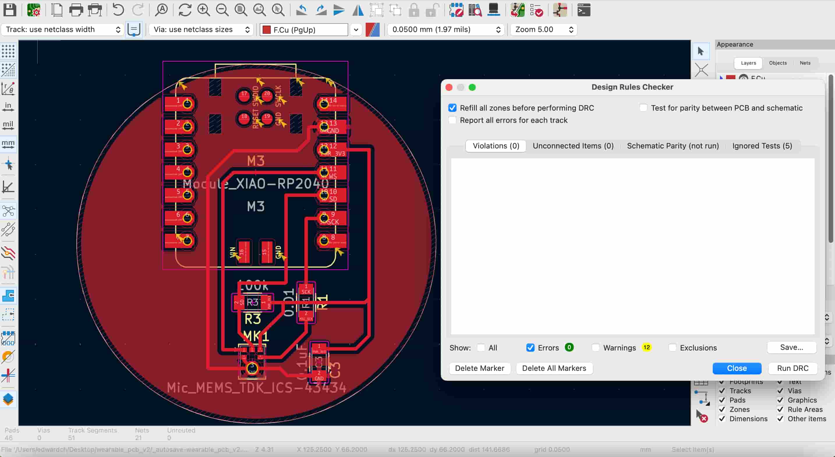 Again, there are some traces that are not cut out, and the part where I am placing my ICS-43434 mic is simply not cut properly. I believe this error is happening because the ICS-43434 is very small and the clearance between each pin is smaller than the required 0.4mm. In fact, during the Design Rule Check, I reduced the minimum clearance from 0.4mm to 0.3mm to remove some of the errors.