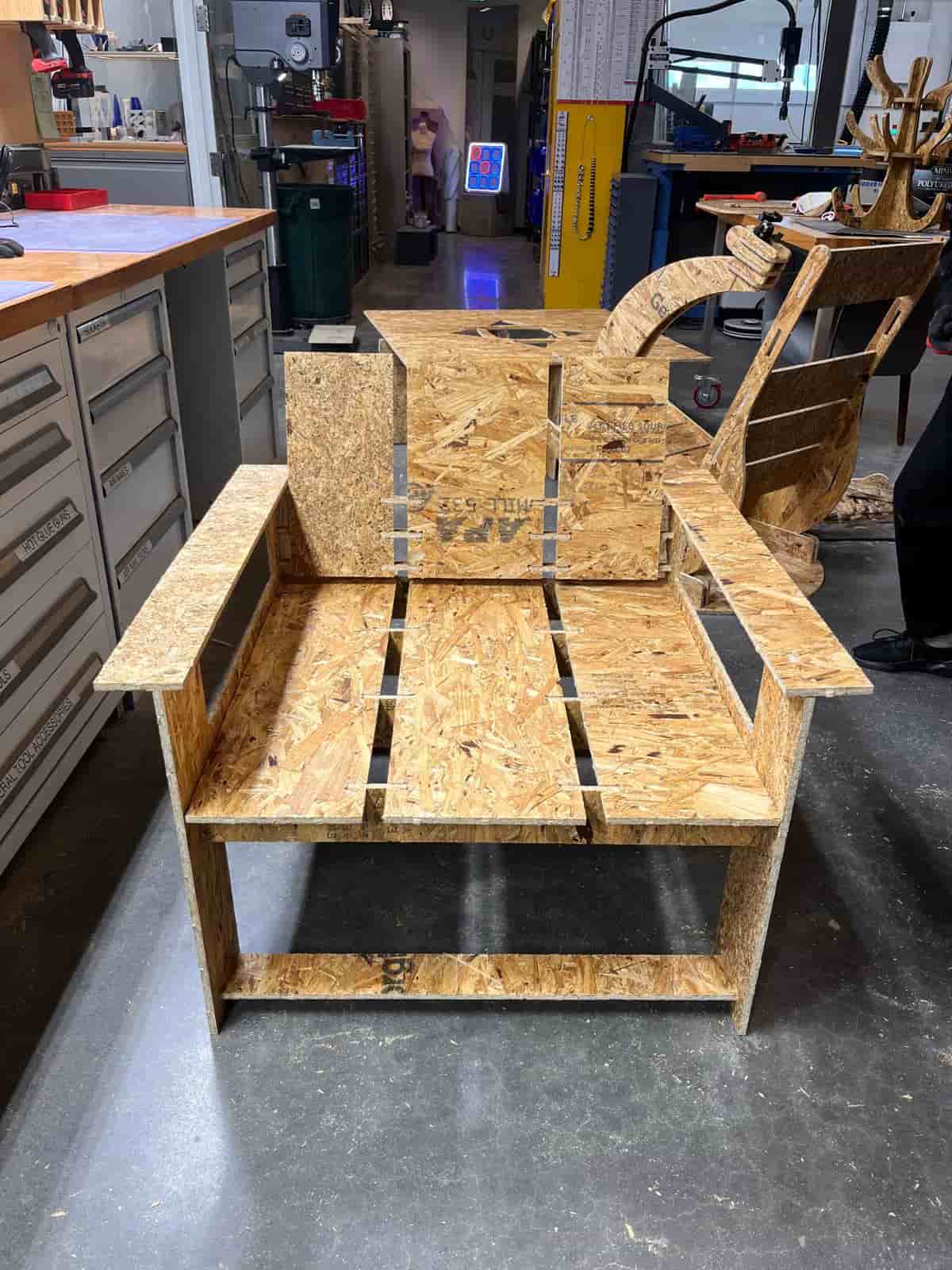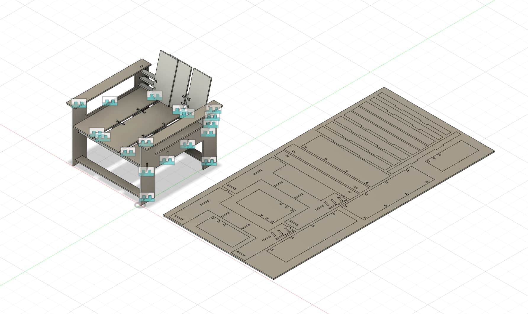 Later, I learned from Ceci that it is better to assemble all my parts before arranging them on the stock. Since I didn't model anything too complex in the earlier weeks, I need to learn how to use joint in Fusion 360 to assemble all of my parts. I also modified my design to use less parts. For example, I reduced the height of the back holster so the back support mostly holds the lower back of the body, compared to before where I had my back support trying to go higher to support my upper back and head. In addition, I reduced some materials from the side frame, changing it from a full enclosed design to a H-shaped design to open up more space for me to place connecting parts during the cut in these extra spaces. My new design takes inspiration from a previous project built by Alice Nasto.