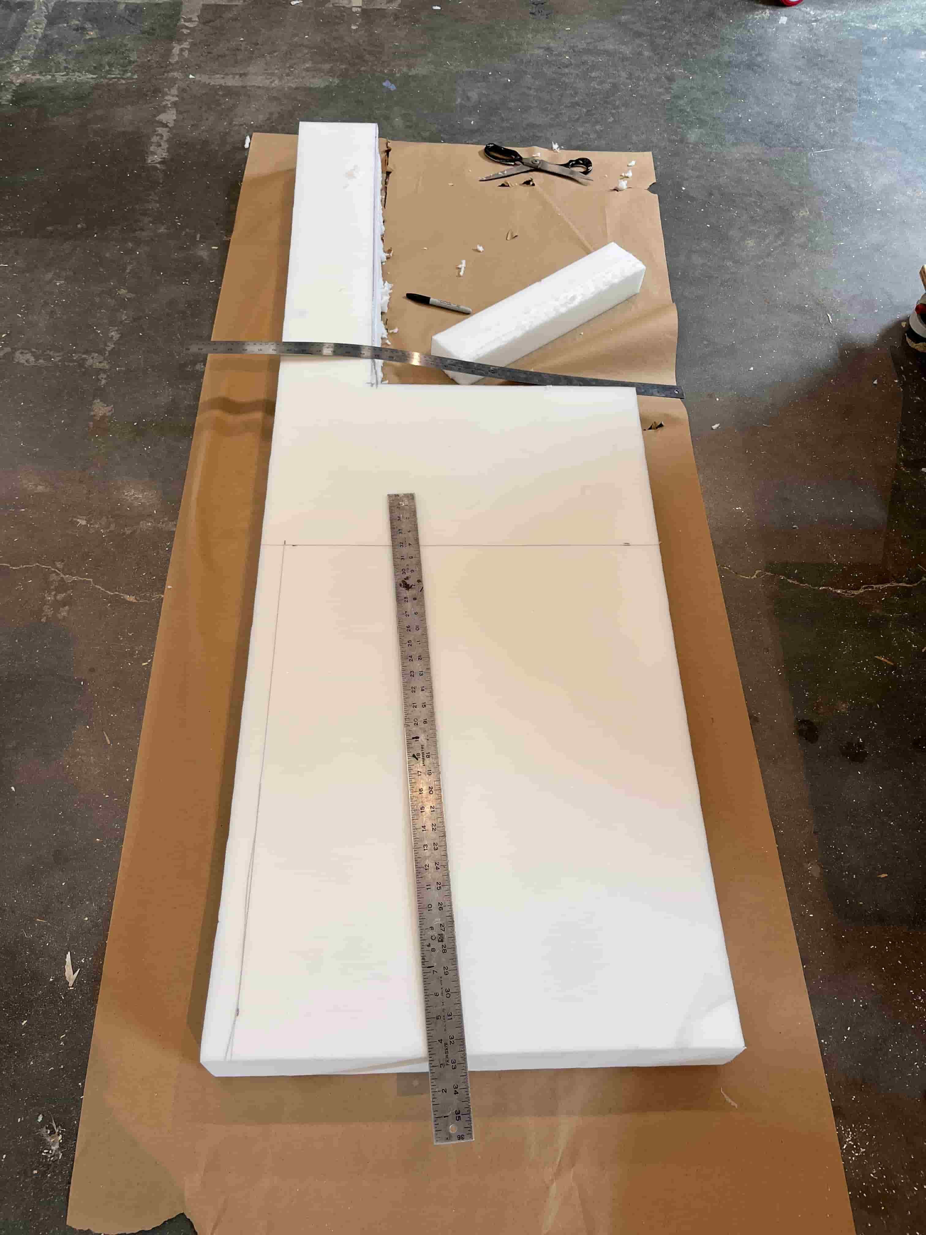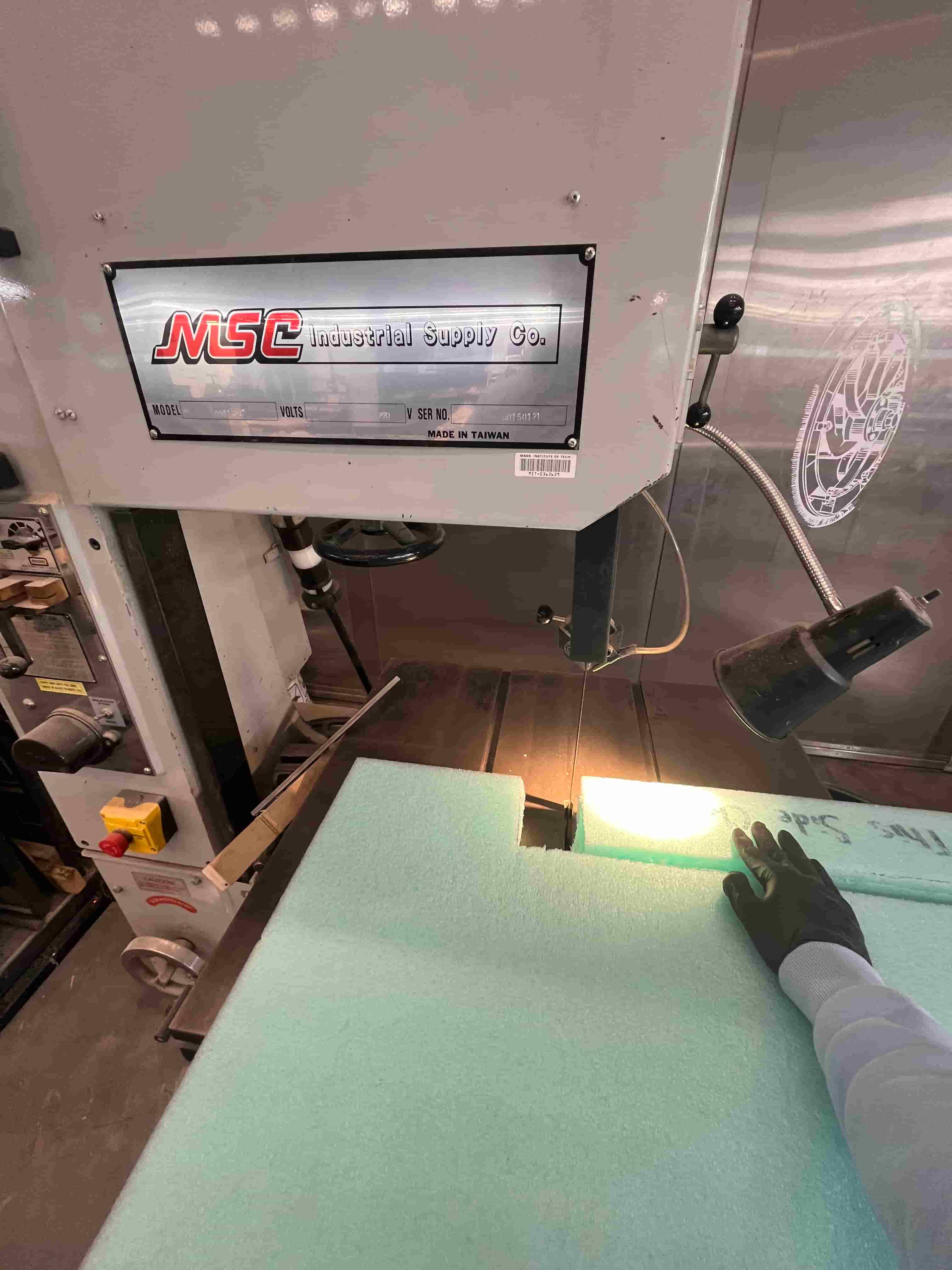 I first purchased some foam and cover to make the seating more comfortable. When the foam arrived, I brought it into the shop to cut it. Initially, I was struggling to find the right tools to cut the foam, because the vertical blade makes the cutting edge very wretched. I eventually switched to a large scissor, and using one end of the scissor to act as a knife and just pull it all the way through the cut. The cutting is pretty smooth, but since the foam is taller than the scissor's blade, the cut at the very bottom is a little bit ragged.