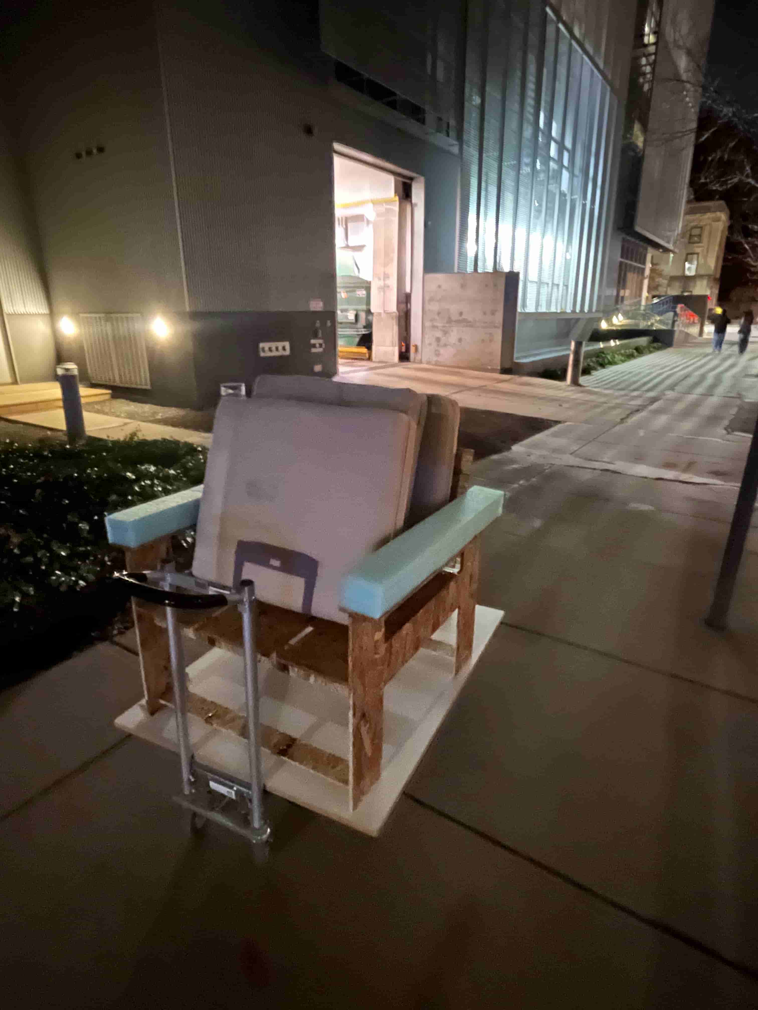 After putting everything together, now it's time to move the chair home. I must look crazy even at night pulling a massive chair across campus.