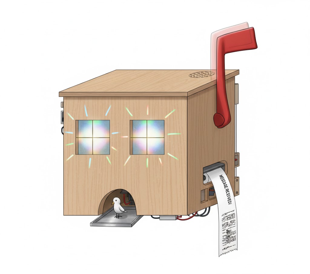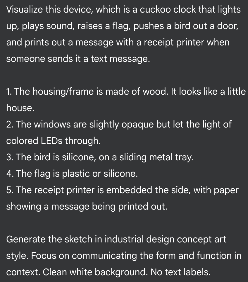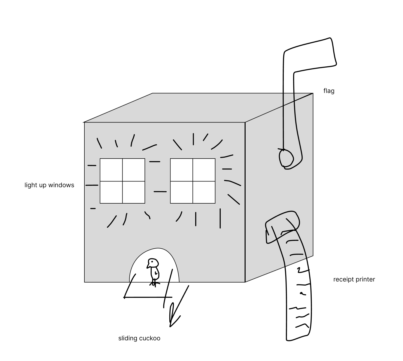 My idea is to give her something like a "Cuckoo Clock" - I could send a message to her little birdhouse, which would then light up, make a sound, raise a flag, reveal the bird, and print out the message on receipt paper.